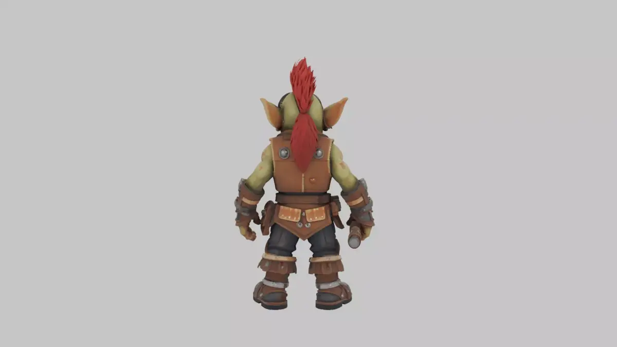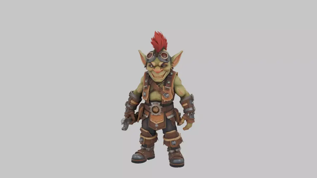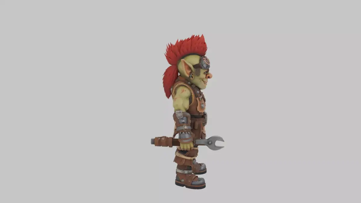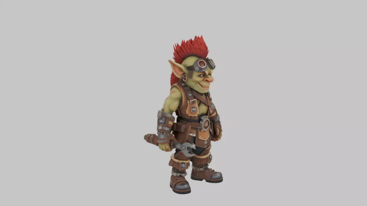 This highly detailed 3D model captures a mischievous goblin engineer straight from the chaotic workshops of World of Warcraft, rendered with intricate precision for immersive gameplay or display. Standing short and stout at about three feet tall, his vibrant green skin gleams with a subtle oily sheen, accented by craggy wrinkles, pointy bat-like ears, a bulbous hooked nose, and a toothy grin revealing jagged yellowed teeth. A wild, fiery red mohawk spikes defiantly atop his bald scalp, adding to his explosive personality. He sports a rugged mechanical leather vest bulging with brass gears, tangled belts, and stuffed tool pouches, paired with grimy oil-stained pants tucked into heavy boots reinforced with dented metal plates for enduring workshop mishaps. Perched on his forehead are oversized tinted goggles, ready to flip down for tinkering, while his calloused hands grip a hefty chrome wrench in one and a crumpled blueprint in the other, arms bearing faded scars from past dynamite disasters. Every texture pops vividly—from the worn leather cracks and metallic glints to the subtle skin pores and fabric weaves—ensuring seamless 360-degree rotation with consistent detailing across front, side, back, and top views, isolated against a clean white backdrop for easy integration into any scene.
