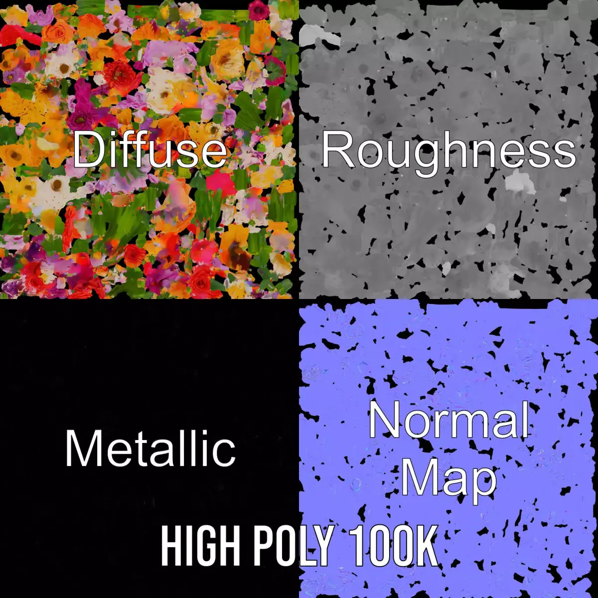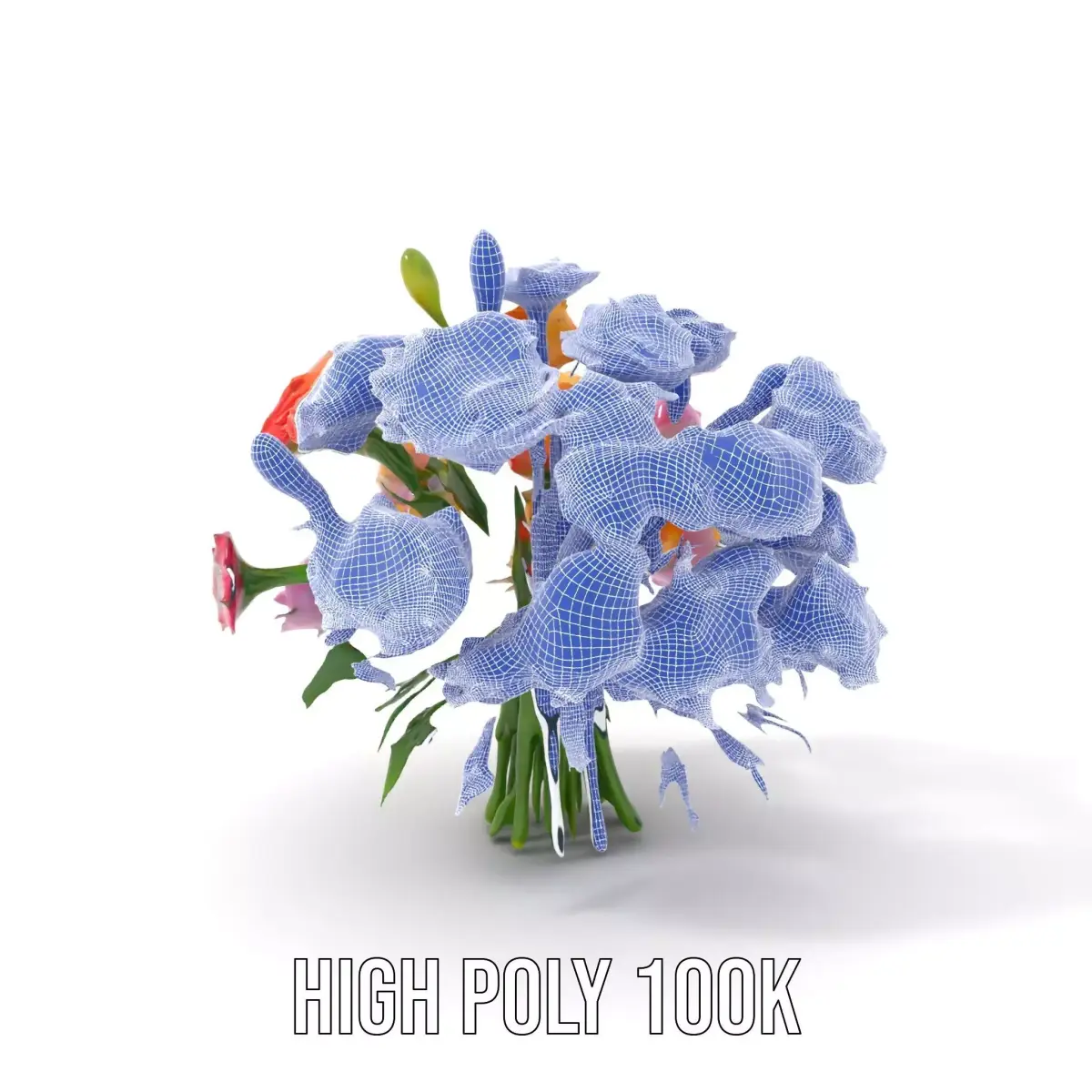 This 3D model features a vibrant floral bouquet, showcasing a variety of colorful blooms. Perfect for enhancing interior design scenes, this model adds a touch of nature to virtual environments. Each model has 3 levels of detail: low-poly (1000 triangles for mobile), middle-poly (10,000 triangles for environment), and high-poly (100,000 triangles), which allows for the use of this model in production rendering (such as 3ds Max, Maya, Cinema4D, Blender, Vray/Corona/Cycles, and all others), game engines (Unity and Unreal compatible), and interactive presentations, providing a choice of detail based on the LOD System principle. The PBR textures include Diffuse, NormalMap, and reflection/roughness/metallic, suitable for any modern rendering engine. All models are accurately unwrapped and have no overlapping UV. All textures are 4096x4096 in size. Perfect for interior design visualizations, floral arrangements in virtual weddings, or garden scenes. Please like and comment if you enjoy this model.