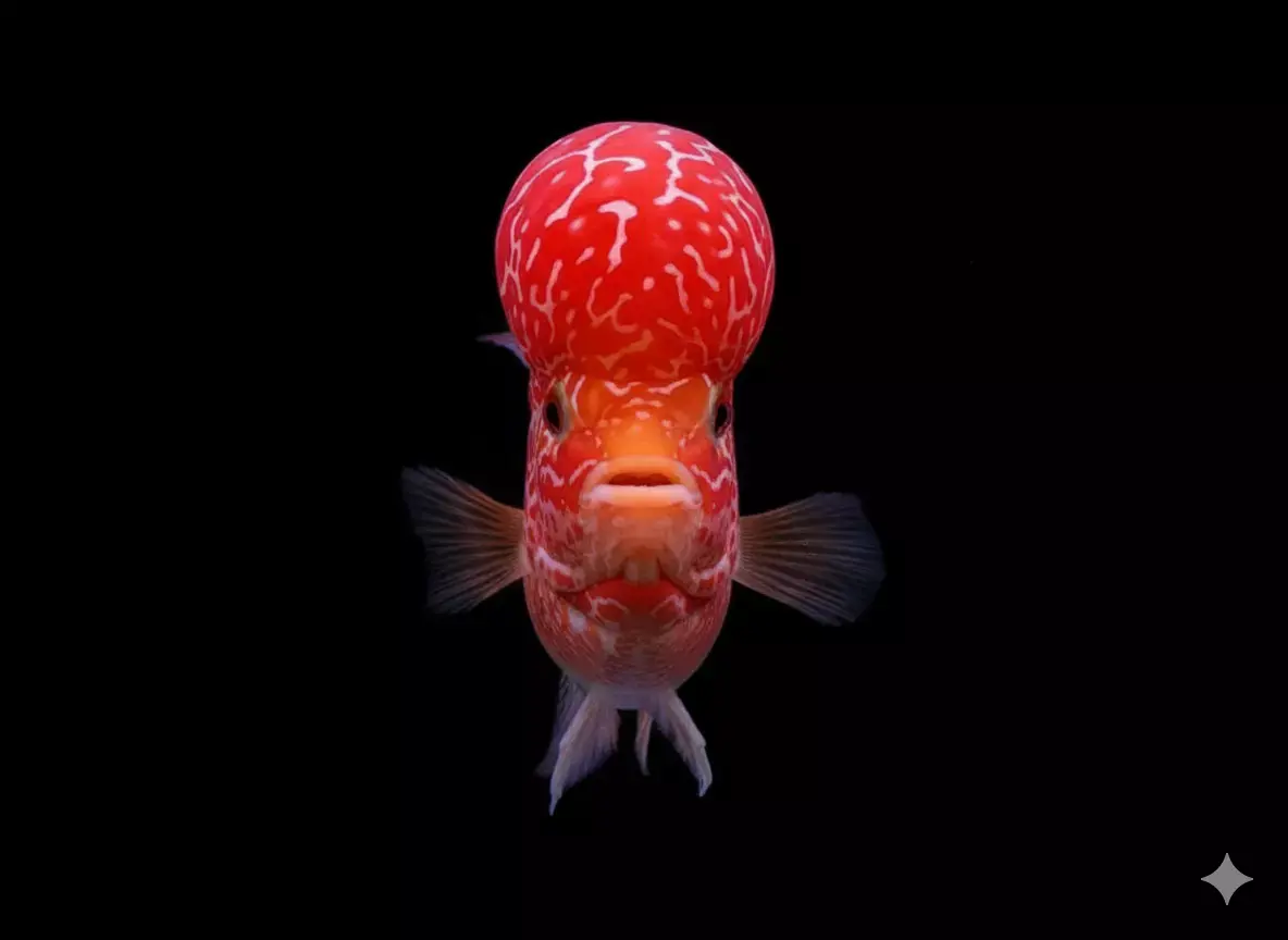 This 3D model captures the striking beauty of a Flowerhorn cichlid, rendered with vivid red and white coloration and intricate scale patterns. The fish’s bulbous head features swirling red markings that contrast sharply with its translucent, flowing fins, while its large, expressive eye adds lifelike detail. The sculpture is posed dynamically mid-swim, emphasizing fluid motion against a stark black background. Key attributes include: