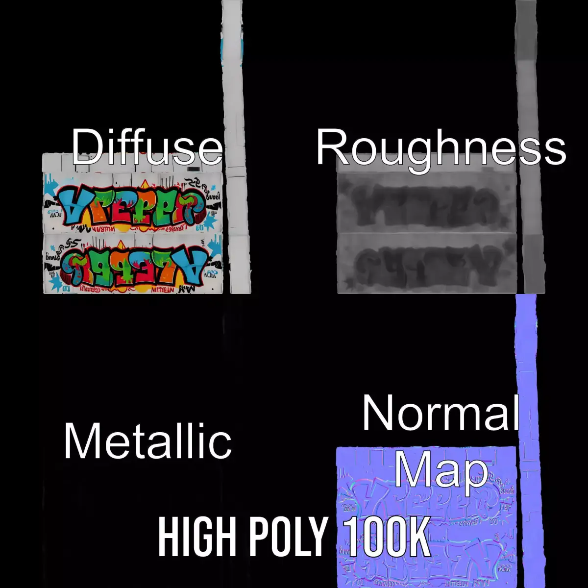 This 3D model pack features an eye-catching graffiti wall, perfect for urban environments or artistic expression scenes. The vivid colors and detailed textures make it ideal for adding a touch of realism and flair to your projects. Each model has 3 levels of detail: low-poly (1000 triangles for mobile), middle-poly (10,000 triangles for environment), and high-poly (100,000 triangles), which allows for use in production rendering (such as 3ds Max, Maya, Cinema 4D, Blender, Vray/Corona/Cycles and all other), game engines (Unity and Unreal compatible), and interactive presentations, providing a choice of detail based on the LOD System principle. The graffiti wall is versatile for virtual cityscapes, cultural exhibitions, or interactive street art installations. The model's textures are PBR, Diffuse, NormalMap, and reflection/roughness/metallic, which are suitable for any modern rendering engine. All models accurately unwrapped with no overlapping UVs. Textures are 4096*4096 in size. If you like this model, please leave a comment and a like.