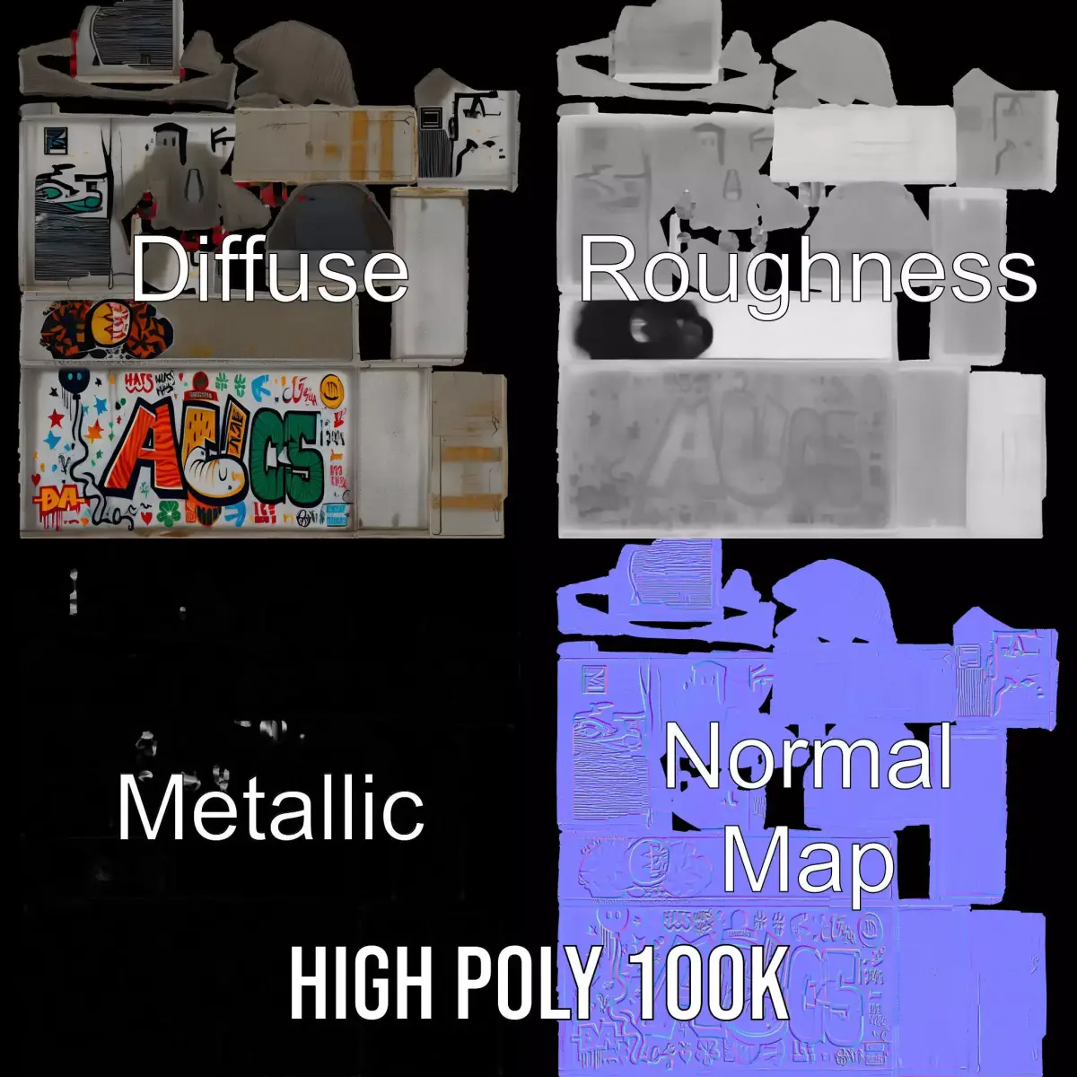 Add an urban vibe to your 3D environments with the Vibrant Graffiti Wall model pack. Ideal for street scenes, virtual graffiti exhibitions, or urban-themed games, this model brings a splash of color and character with its detailed graffiti art. Each model has 3 levels of detail: low-poly (1000 triangles for mobile), middle-poly (10,000 triangles for environment), and high-poly (100,000 triangles), which allows for the use of this model in production rendering (such as 3ds Max, Maya, Cinema 4D, Blender, Vray/Corona/Cycles and all other), game engines (Unity and Unreal compatible), and interactive presentations, providing a choice of detail based on the LOD System principle. The model's textures are PBR, Diffuse, NormalMap, and reflection/roughness/metallic, which are suitable for any modern rendering engine. All models are accurately unwrapped and have no overlapping UVs. Textures are 4096*4096 in size. If you like this model, please give it a like and leave a comment!