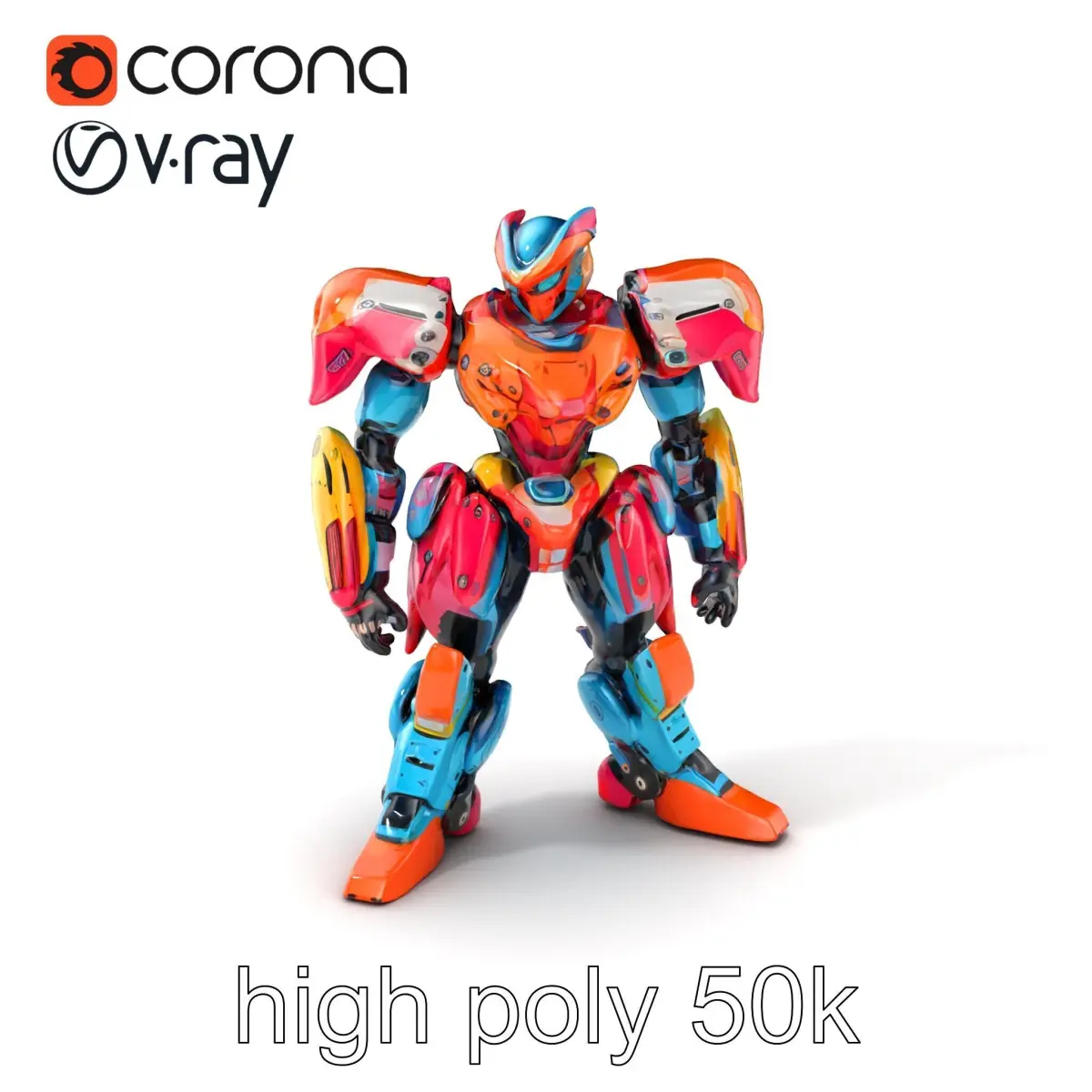 Each model has 3 levels of detail: low-poly, middle-poly, and high-poly, which allows for the use of this model in production rendering (such as 3ds max, Maya, Cinema4d, Blender, Vray/Corona/Cycles and all others), game engines (Unity and Unreal compatible), and interactive presentations, providing a choice of detail based on the LOD System principle. This vibrant humanoid combat robot with intricate armor is ideal for futuristic games, sci-fi animations, and virtual reality experiences, showcasing advanced technological features and realistic textures. The model's textures are PBR, Diffuse, NormalMap, and reflection/roughness/metallic, which are suitable for any modern rendering engine. All models are accurately unwrapped and have no overlapping UV. All textures are 4096*4096 in size. If you like this model, please leave a comment and a like!