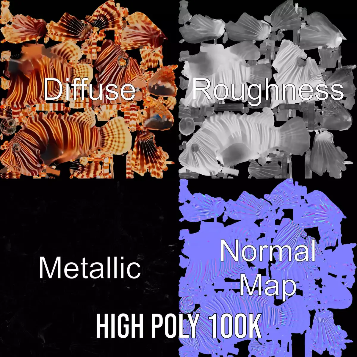 The Vibrant Lionfish Aquatic model pack showcases a beautifully detailed 3D model of a lionfish, notable for its striking orange and white stripes. Perfectly suited for underwater scenes, marine life simulations, and educational content, this model delivers high realism with PBR textures and multiple LODs. Whether used in game engines or production rendering tools, users will appreciate the precision of the unwrapped UVs and the exceptional detail offered by 4096*4096 textures. Ideal for enhancing any marine-themed project.