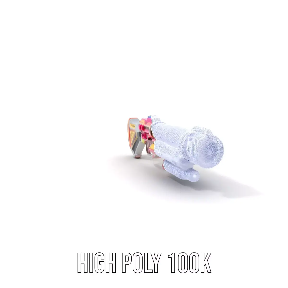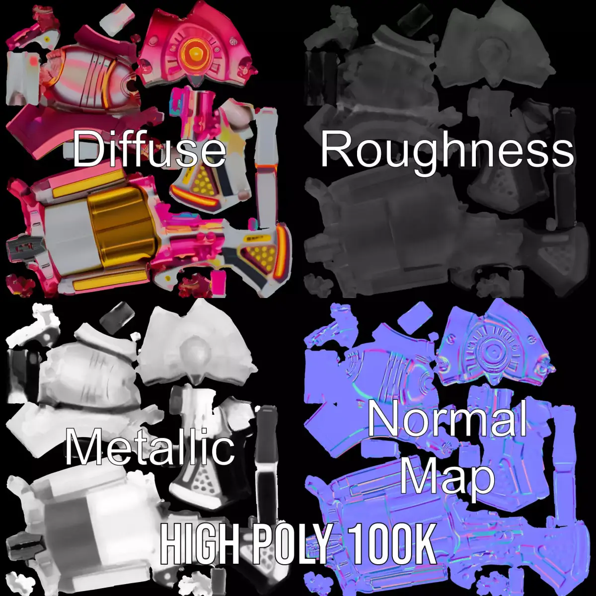 The Vibrant Neon Blaster model pack is a stunning representation of a futuristic weapon, featuring vivid colors and intricate details. Each model has 3 levels of detail: low-poly (1000 triangles for mobile), middle-poly (10,000 triangles for environment), and high-poly (100,000 triangles), which allows for the use of this model in production rendering (such as 3ds max, Maya, Cinema 4D, Blender, Vray/Corona/Cycles and all others), game engines (Unity and Unreal compatible), and interactive presentations, providing a choice of detail based on the LOD System principle. Its colorful design makes it perfect for sci-fi games, animations, and virtual reality experiences. The model's textures are PBR, Diffuse, NormalMap, and reflection/roughness/metallic, which are suitable for any modern rendering engine. All models accurately unwrapped and have no overlapping UV. All textures are 4096x4096 in size.