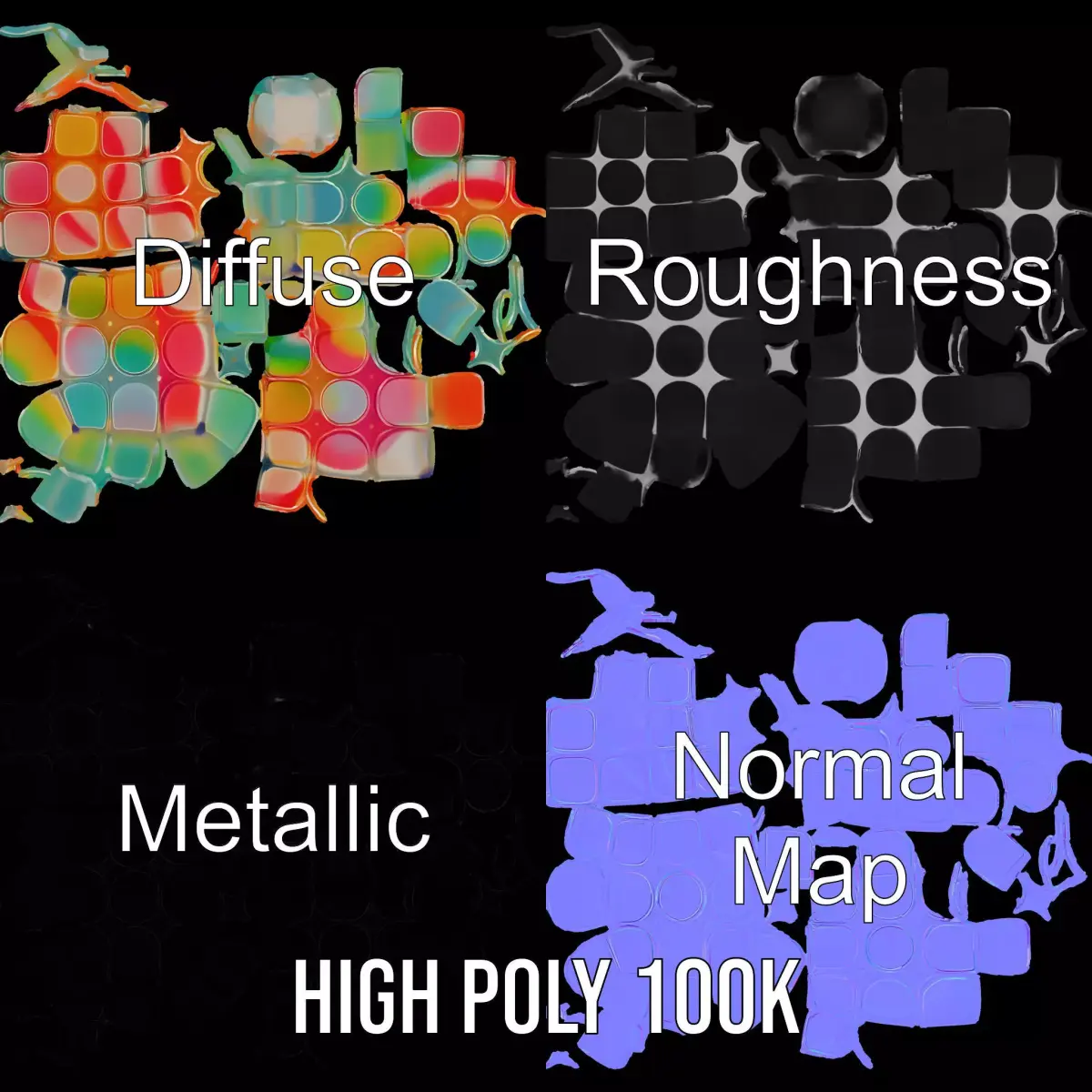 This vibrant puzzle cube model pack offers a stunning array of colors for a visually captivating experience. Each model features smooth, rounded edges and a glossy finish, perfect for creating engaging visual effects or enhancing interactive presentations. Ideal for virtual reality games, educational apps, or animated films, this model adapts seamlessly to various creative applications. Each model has 3 levels of detail: low-poly(1000 triangles for mobile), middle-poly(10 000 triangles for environment), and high-poly(100 000 triangles), which allows for the use of this model in production rendering (such as 3ds Max, Maya, Cinema 4D, Blender, Vray/Corona/Cycles and all other), game engines (Unity and Unreal compatible), and interactive presentations, providing a choice of detail based on the LOD system principle. The model's textures are PBR, Diffuse, NormalMap, and Reflection/Roughness/Metallic, which are suitable for any modern rendering engine. All models are accurately unwrapped and have no overlapping UV. All textures are 4096*4096 in size. If you like this model, please leave a comment and a like.