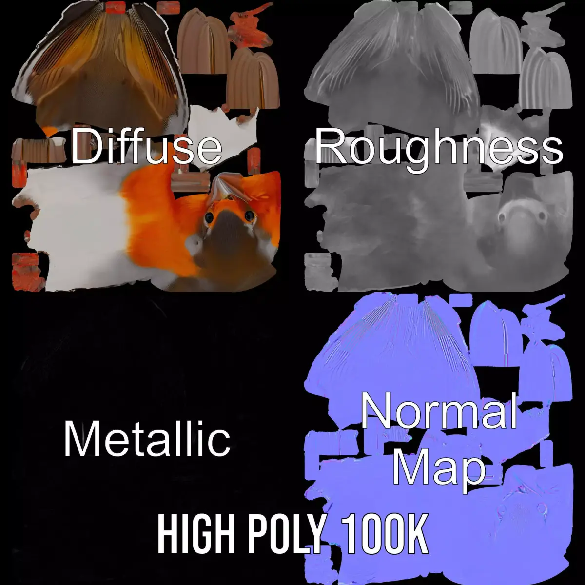 This stunning 3D model of a vibrant robin bird captures the grace and beauty of this beloved avian species. Perfectly detailed with realistic textures, this model is ideal for scenarios in nature documentaries, educational projects, and virtual wildlife scenes. Each model has 3 levels of detail: low-poly (1000 triangles for mobile), middle-poly (10,000 triangles for environment), and high-poly (100,000 triangles), which allows for the use of this model in production rendering (such as 3ds Max, Maya, Cinema4D, Blender, Vray/Corona/Cycles and all other), game engines (Unity and Unreal compatible), and interactive presentations, providing a choice of detail based on the LOD System principle. The model's textures are PBR, Diffuse, NormalMap, and reflection/roughness/metallic, which are suitable for any modern rendering engine. All models are accurately unwrapped and have no overlapping UV. All textures are 4096*4096 in size. Please like and leave a comment for the model if you enjoyed it.