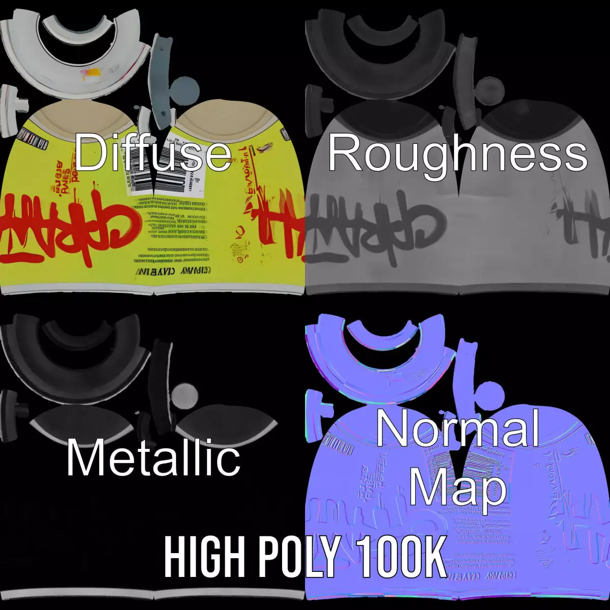 This 3D model showcases a vibrant spray can design, perfect for urban and industrial scenes. Each model comes with three levels of detail, making it versatile for use in mobile gaming, detailed 3D environments, and high-quality production renderings. The model is compatible with all major game engines like Unity and Unreal, as well as rendering software including 3ds Max, Maya, and Blender. Ideal for street art project visualizations, animations, and advertising mockups, the spray can model features PBR textures with diffuse, normal maps, and reflection/roughness/metallic options, each at a crisp 4096x4096 resolution. Models are accurately unwrapped with no overlapping UVs to ensure seamless texturing. If you enjoy this model, please like and leave a comment!