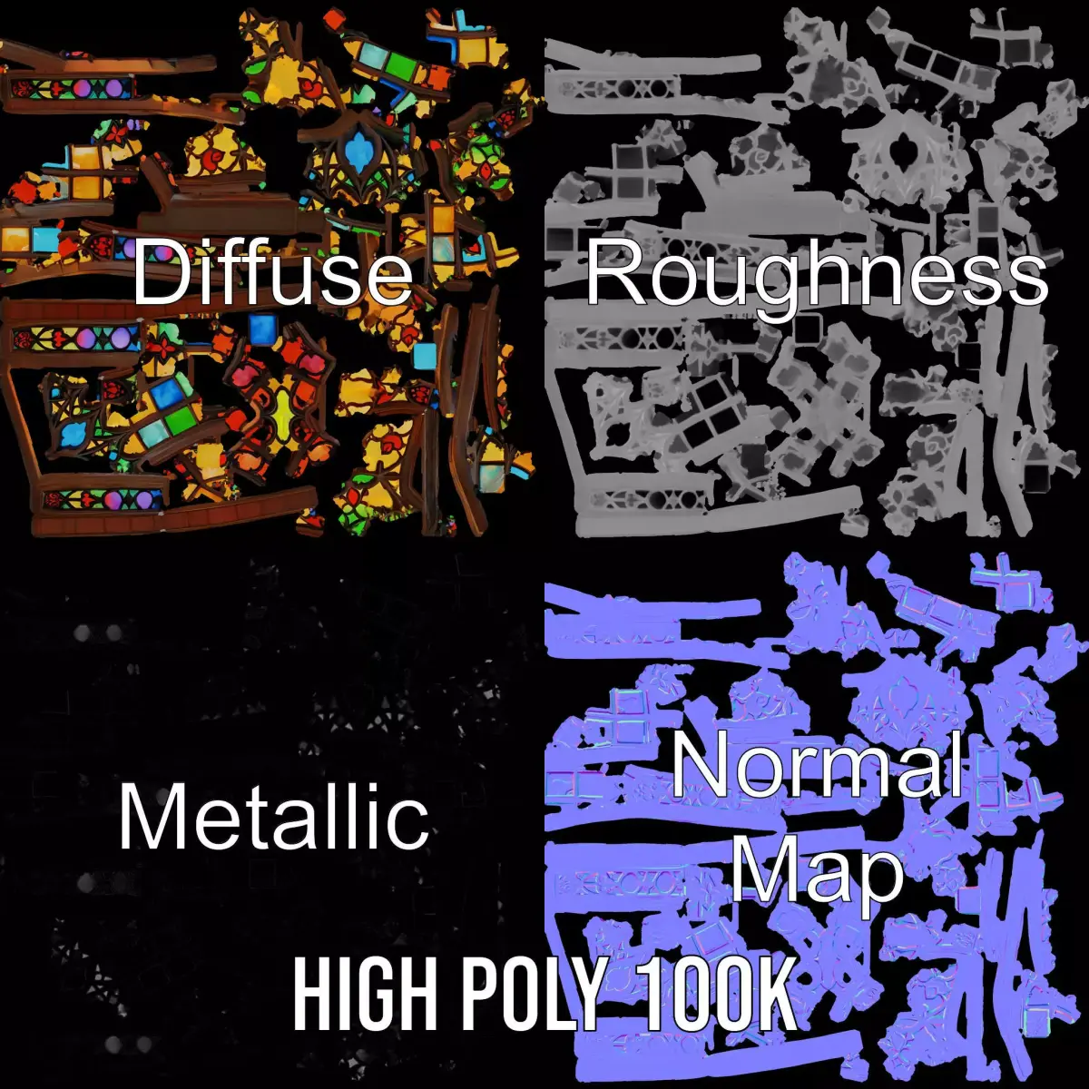 This vibrant stained glass window model is a stunning representation of classic church architecture. Perfect for use in historical scenes, architectural visualizations, or as a focal point in interior designs, this model captures the beauty and intricacy of stained glass artistry. Each model has 3 levels of detail: low-poly(1000 triangles for mobile), middle-poly(10 000 triangles for environment), and high-poly(100 000 triangles), which allows for the use of this model in production rendering(such as 3ds max, Maya, Cinema4d, Blender, Vray/Corona/Cycles and all other ), game engines(Unity and Unreal compatible), and interactive presentations, providing a choice of detail based on the LOD System principle.
