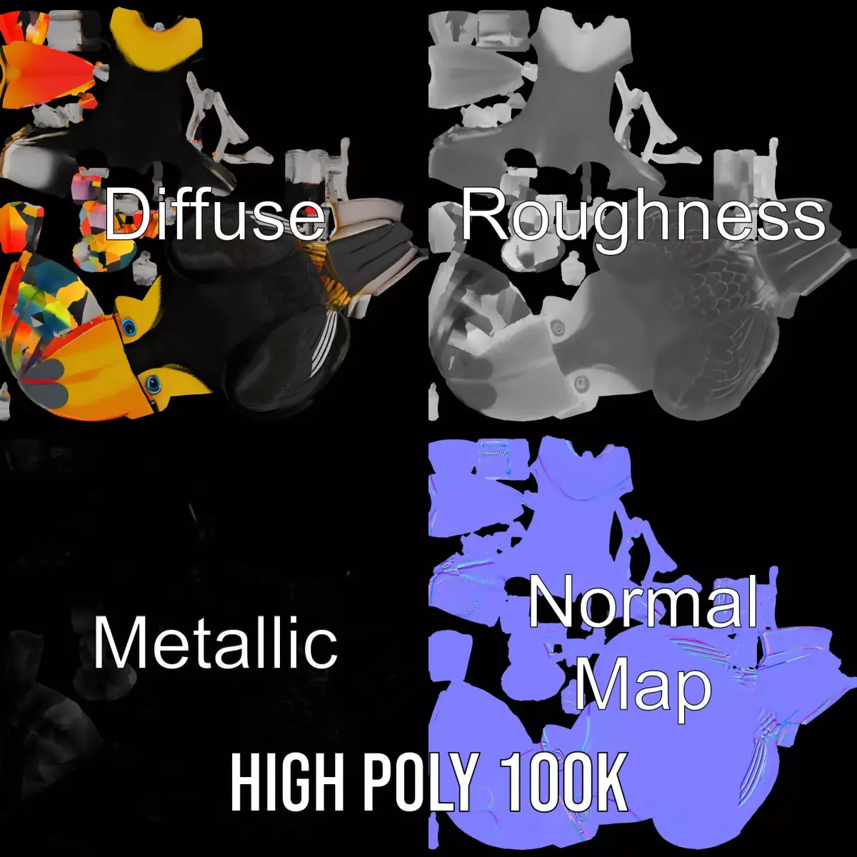 This vibrant and detailed toucan bird model pack offers an exquisite representation of this exotic bird species. Ideal for use in wildlife simulations, educational tools, and animated films, it displays the bird’s vivid colors and distinctive features. Each model has 3 levels of detail: low-poly (1000 triangles for mobile), middle-poly (10,000 triangles for environment), and high-poly (100,000 triangles), which allows for the use of this model in production rendering (such as 3ds Max, Maya, Cinema4D, Blender, Vray/Corona/Cycles and all other), game engines (Unity and Unreal compatible), and interactive presentations, providing a choice of detail based on the LOD System principle. The model's textures are PBR, Diffuse, NormalMap, and reflection/roughness/metallic, which are suitable for any modern rendering engine. All models accurately unwrapped and have no overlapping UV. All textures are 4096x4096 in size. If you liked this model, please like and leave a comment.