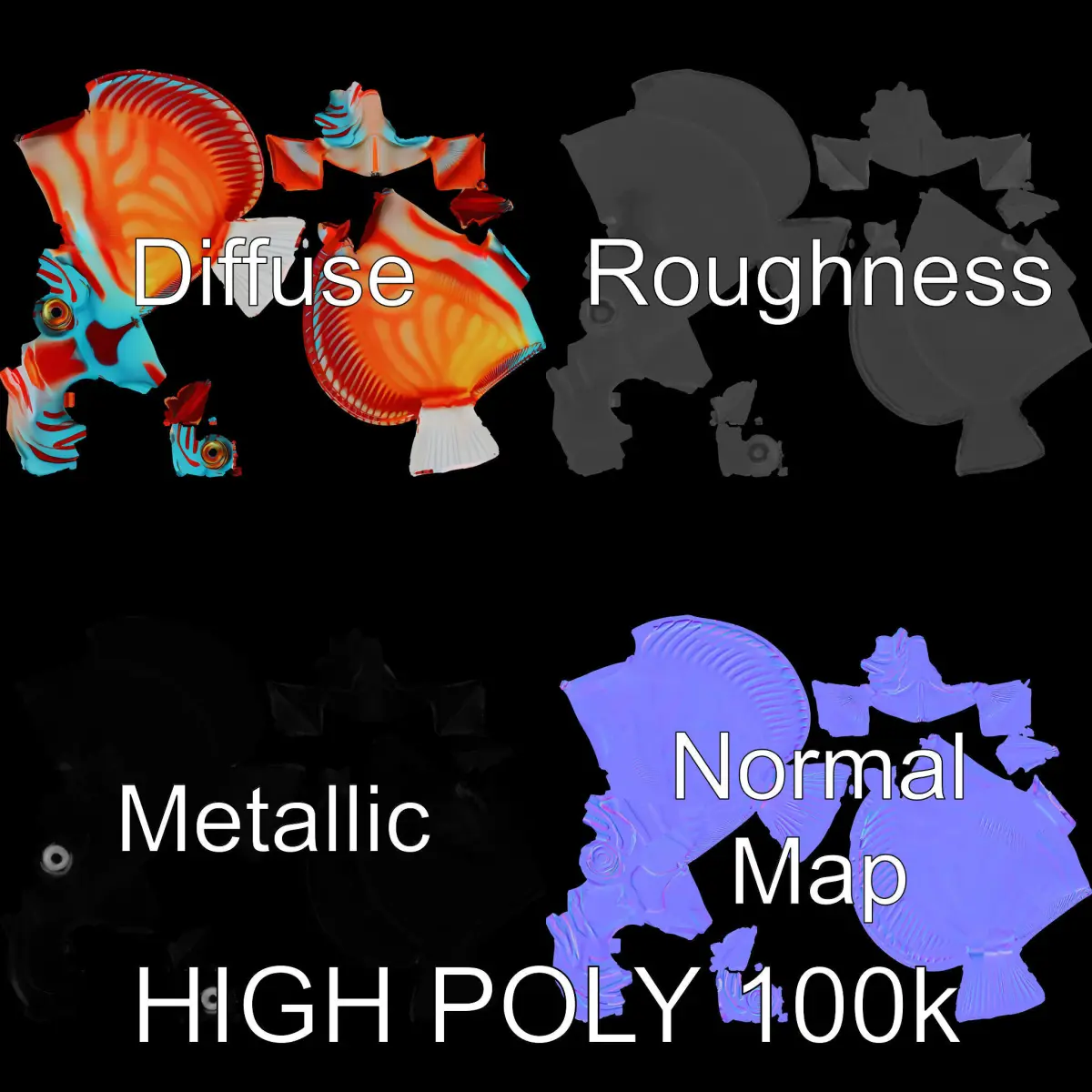 This 3D model pack features an exquisitely detailed tropical fish, available in three levels of detail: low-poly, middle-poly, and high-poly, suitable for diverse applications. It is perfect for enhancing aquatic scenes in video games, virtual reality projects, or educational visuals. The model's textures are high-quality PBR, including Diffuse, NormalMap, and reflection/roughness/metallic, ensuring compatibility with modern rendering engines. Models are precisely unwrapped with no overlapping UVs, and textures are sized at 4096x4096.