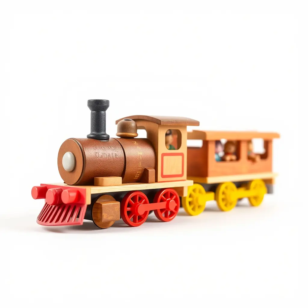 This vibrant wooden train set is ideal for use in children's games, educational apps, and toy design visualizations. Its charming and colorful design makes it perfect for playful scenes and animations.