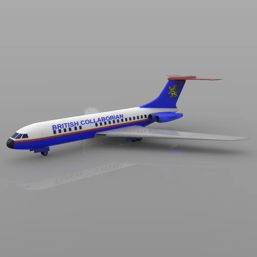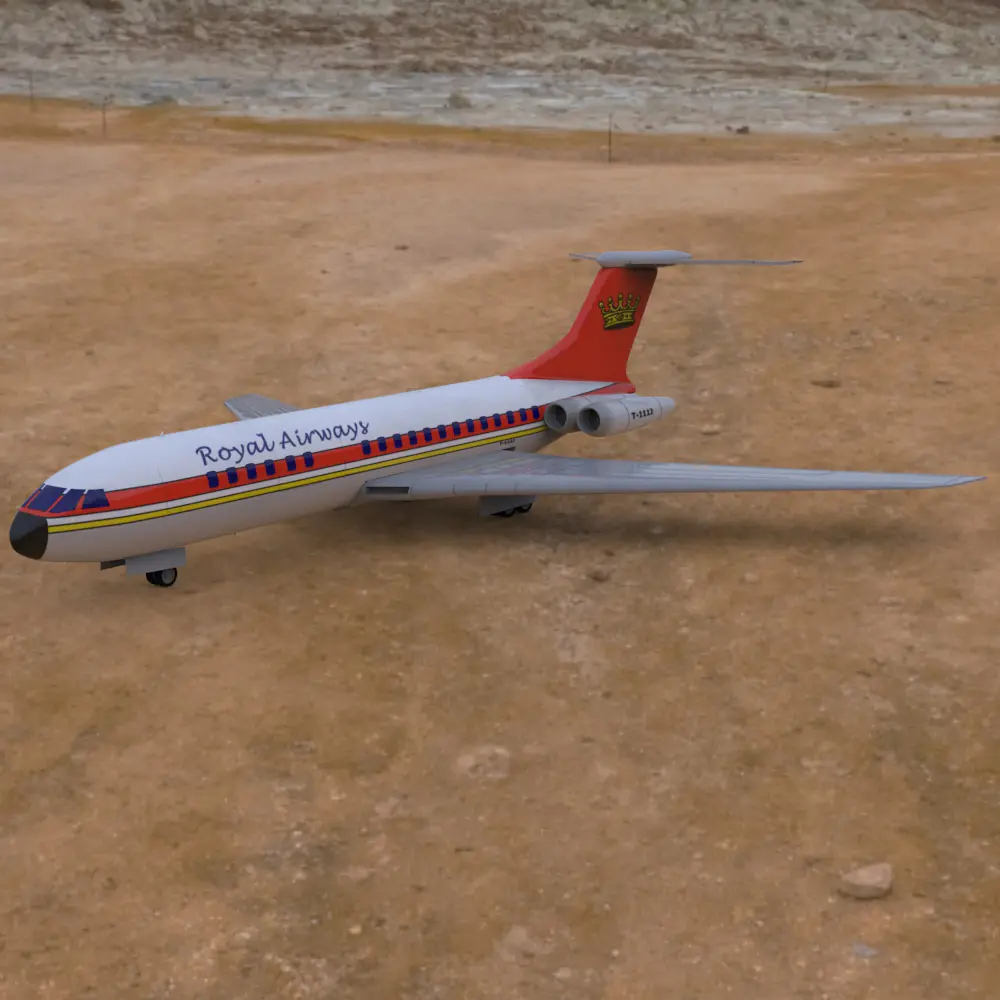 This aircraft model is inspired by the design of the Vickers VC-10, a four-engine, civilian passenger aircraft.