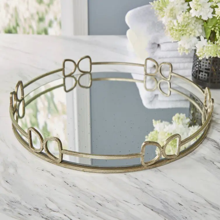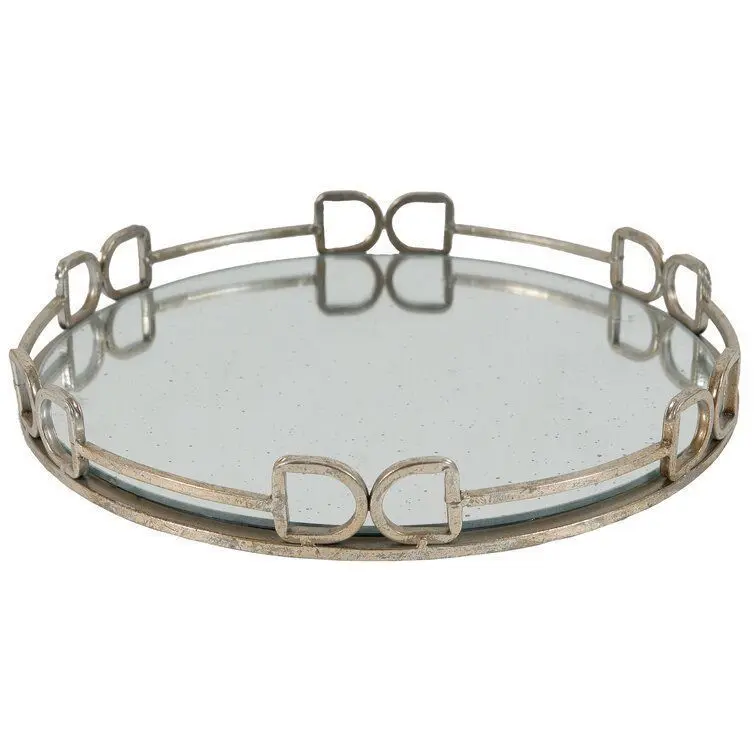 - From organizing free-floating accents into a cohesive display to playing with shape and texture, a well-placed tray saves the day (and looks good doing it!) Crafted from a black-flecked reflective glass surface, it's surrounded by a metal frame in an Antique Silver hue for a glamorous look. Use it as a starting point for decorative arrangements such as candle groupings, table centerpieces, and more.