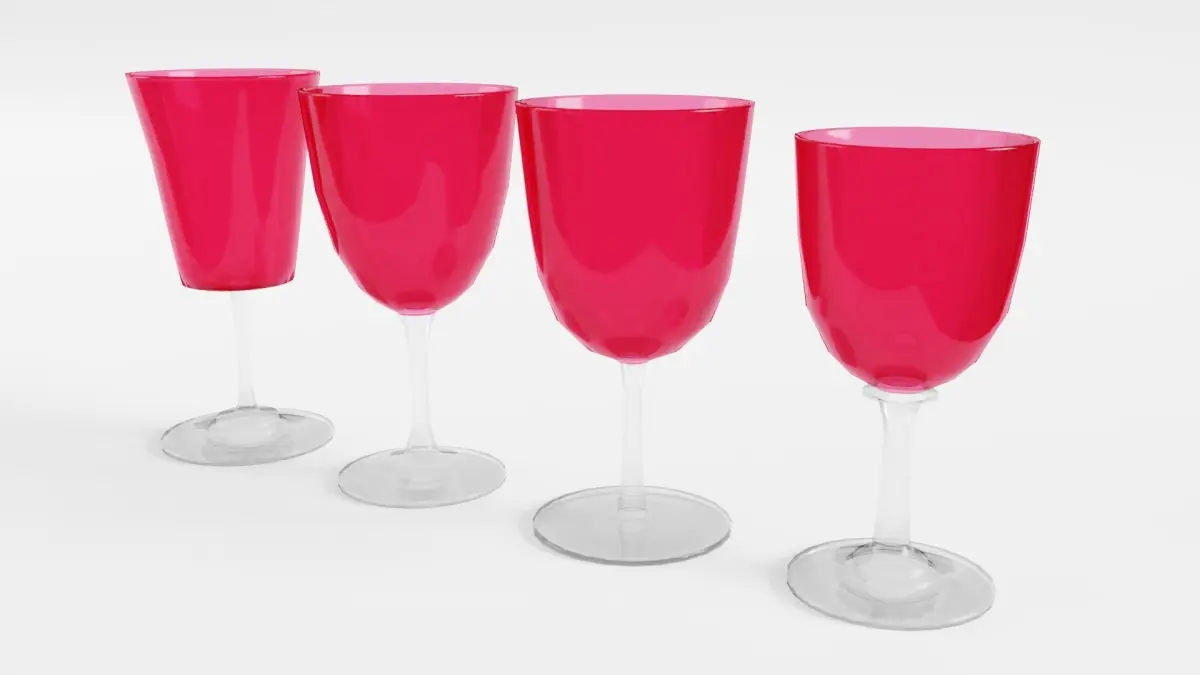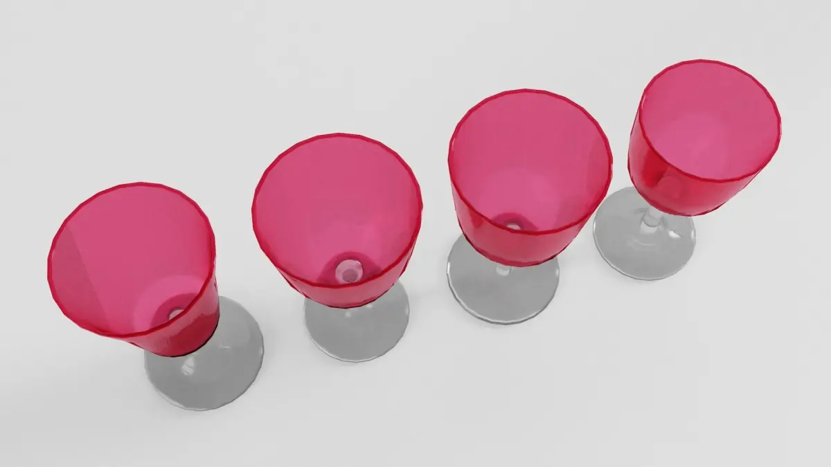 The glasses have real world scale and measure from 12 cm to 13 cm in height. The individual objects are seperate, but grouped meshes. Exception: in the .ply-file they are joined together.