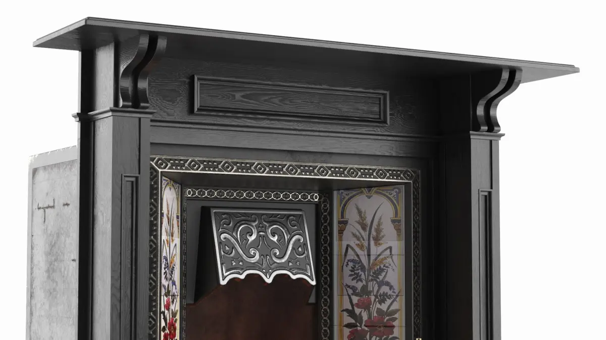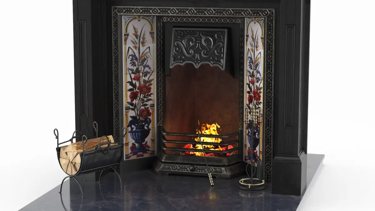 This type of fireplace is a Victorian-era antique that features classical design elements like carved mantels, ornate metalwork, and decorative tiling. It reflects the stylistic preferences of 19th-century British interior design and craftsmanship.