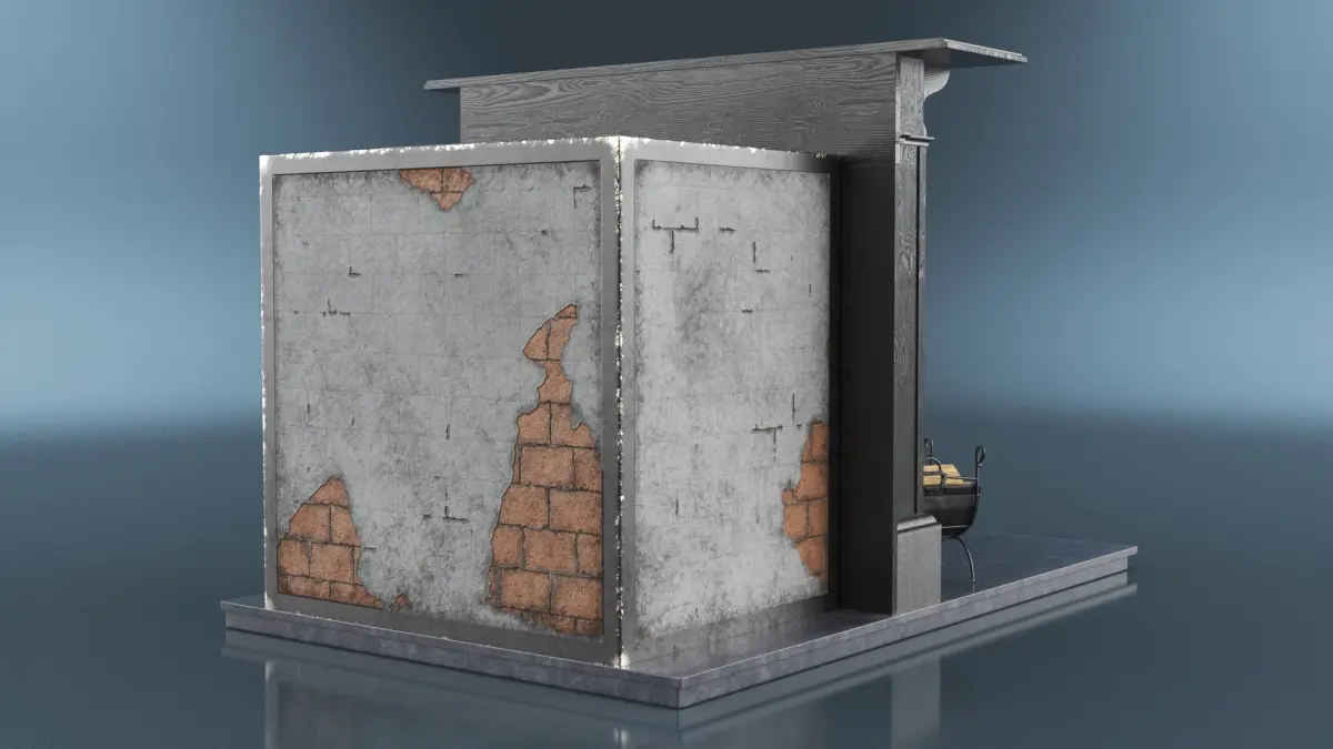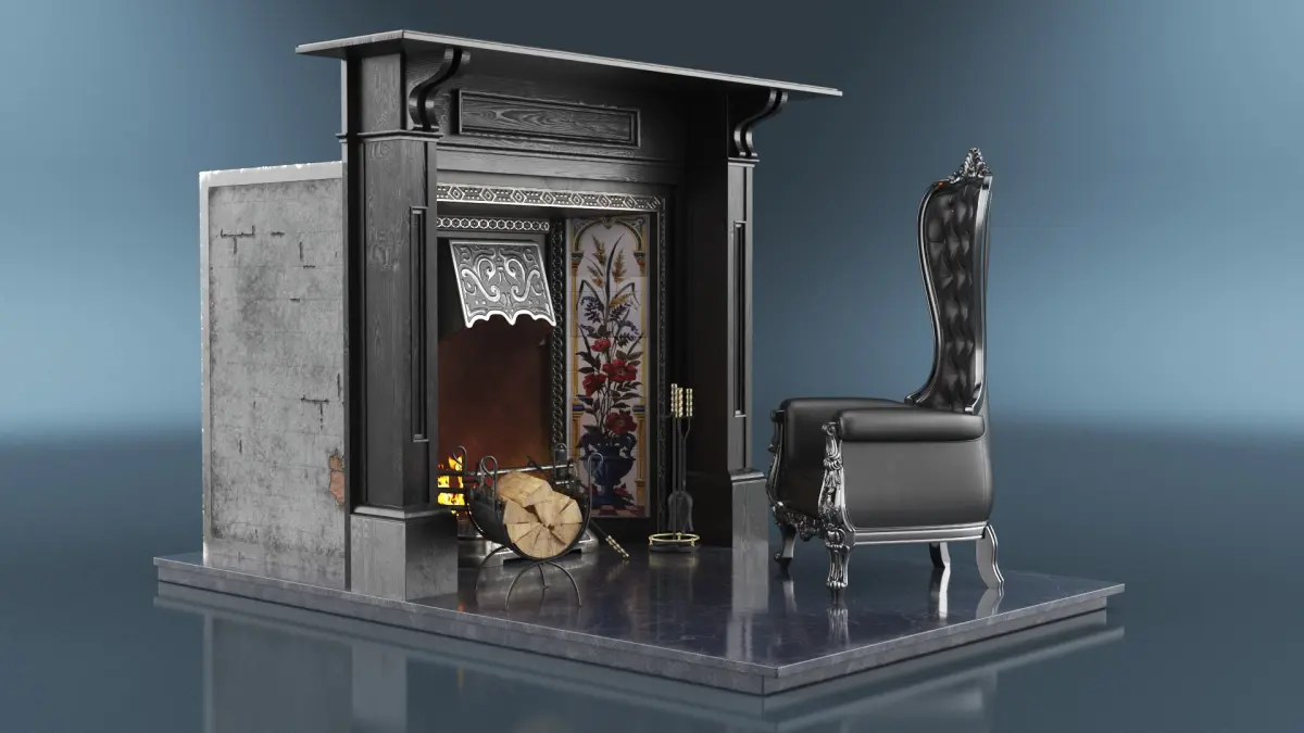 Victorian Fireplace with Leather Chair is a three-dimensional model of antique classical fireplace, that is a traditional chimney design, that known for its ornate detailing, cast iron elements, and historical charm.