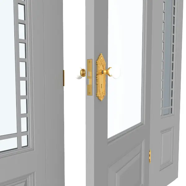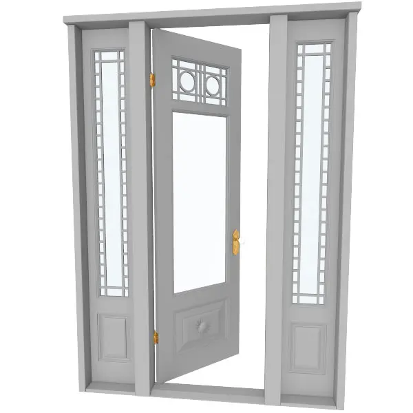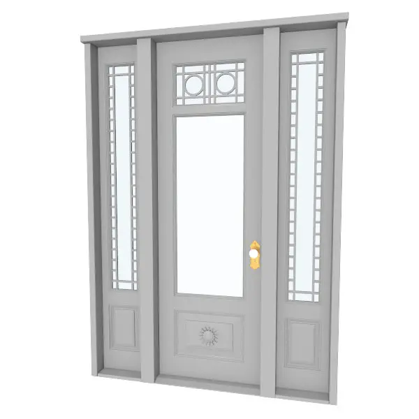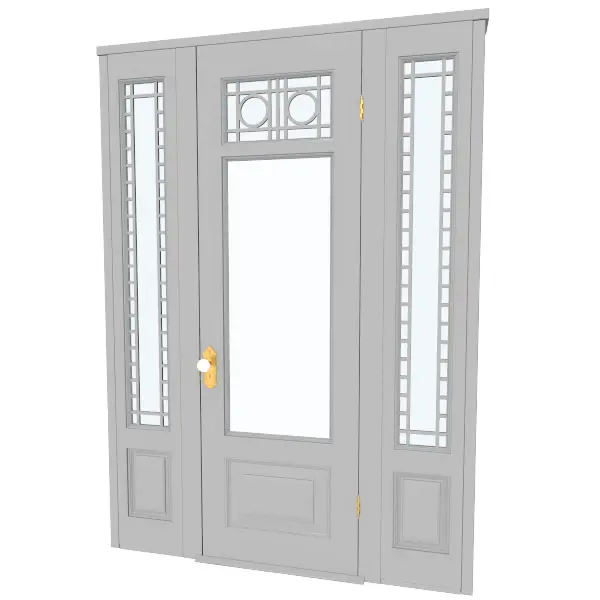 This is a highly detailed 3d model of an 8' door with side panels and decorative panels. This model also includes highly detailed door knob hardware and hinge assemblies.