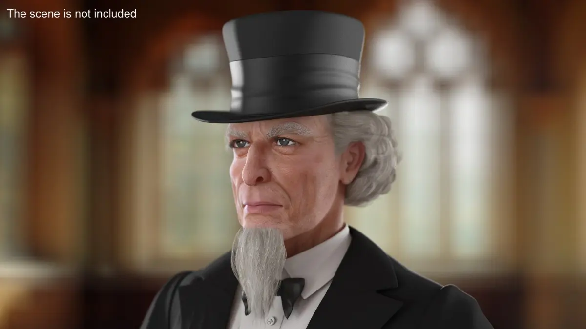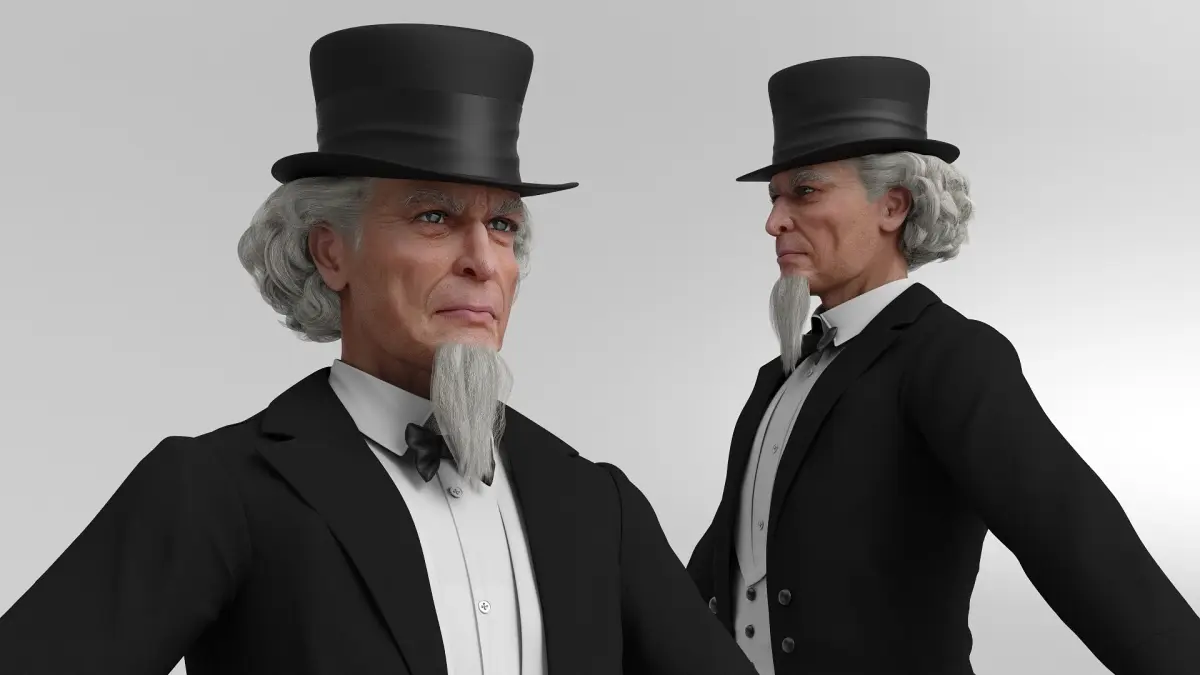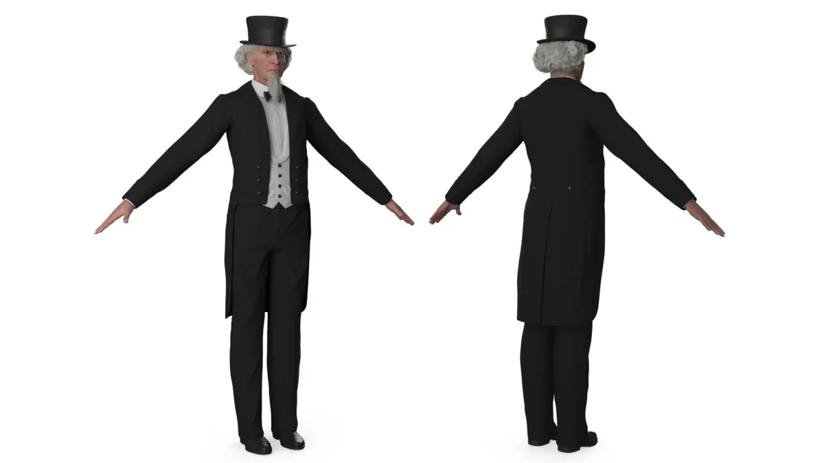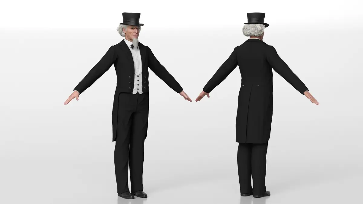 Victorian Gentleman Character in Black Tailcoat A-Pose is a three-dimensional model of distinguished gentleman dressed in traditional 19th-century fashion, showcasing a classic Victorian style.