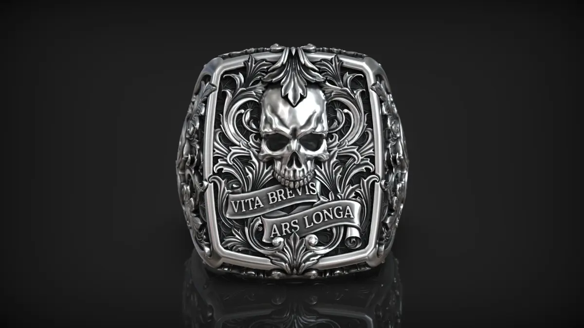 Victorian Gothic Skull Ring 3D Model Vita Brevis Ars Longa Latin Motto