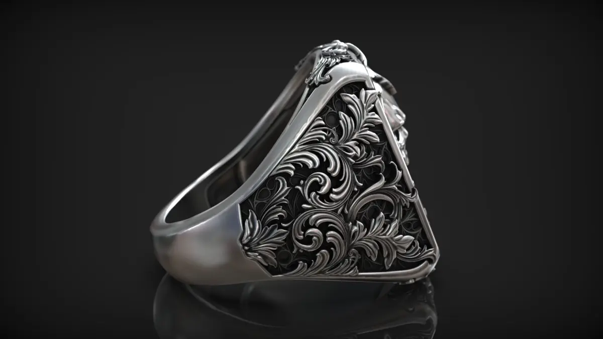 The ring features symmetrical relief details on the sides, echoing 19th-century Victorian elegance and Gothic symbolism. Perfect for jewelry artists, 3D print enthusiasts, and digital renderings, this ring is suitable for silver or gold casting and is designed with high-resolution ornamental detail optimized for manufacturing.