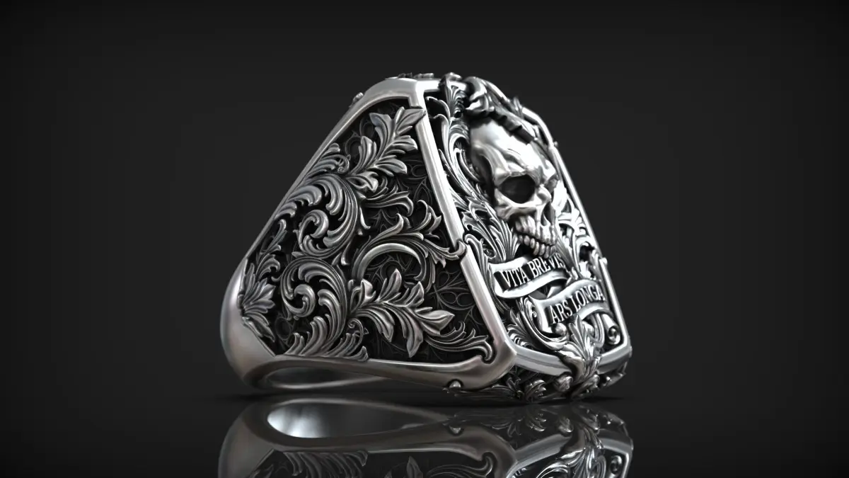 This highly detailed 3D model depicts a statement skull ring in a unique blend of Victorian and Gothic style. At the center of the design stands a sculpted skull surrounded by intricate floral scrollwork, richly ornamented with baroque-inspired patterns. A flowing banner wraps around the skull, engraved with the Latin phrase:VITA BREVIS, ARS LONGA – Life is short, art is long.