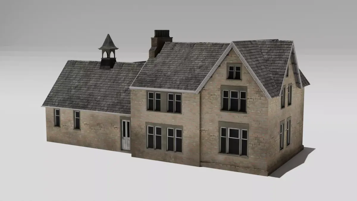 This model features a detailed brick façade, slate roof, gothic-style windows, decorative gables, chimney, and chapel-inspired architectural elements, making it perfect for historical, fantasy, medieval, or atmospheric scenes.