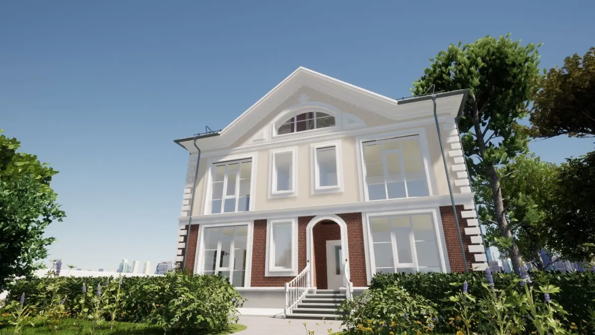 A two-storey residential cottage made of brick with a sloped wooden roof. This is a project completed in Revit version 2020.Ground Floor level contains an office room, a kitchen, a gym, a common room, a toilet and a bathroom. There is also a staircase in top left side of the building leading to the First floor. On the first floor there are three bedrooms, a nursery room, a bathroom and a dressing room. All rooms have large windows making the house bright inside.