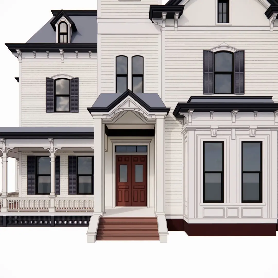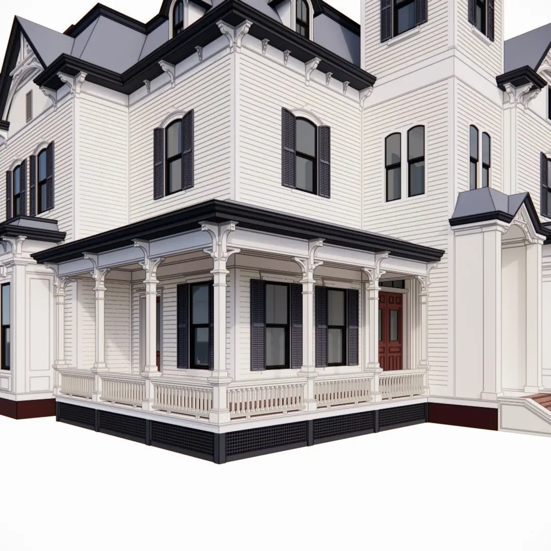 The house:An elegant 3-story massive Victorian home with a tower at the entrance. The main entrance has a decorative tower with modest stairs and a wrap-around porch. There are two box-bay windows with details and full-height windows. The sides have decorative porches but simplified in column detailing. The model you'll be purchasing is exclusively an exterior model. No interior parts have been modeled for this project.