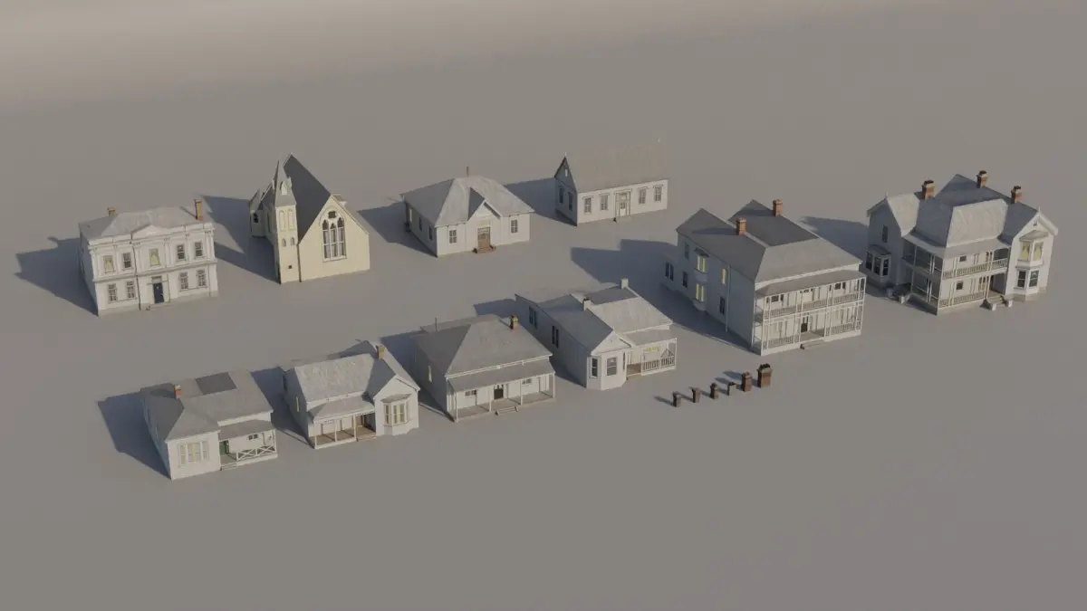 The pack includes 10 houses (6 villas, bank, church, shop, school) and 6 simple chimney decoration objects.