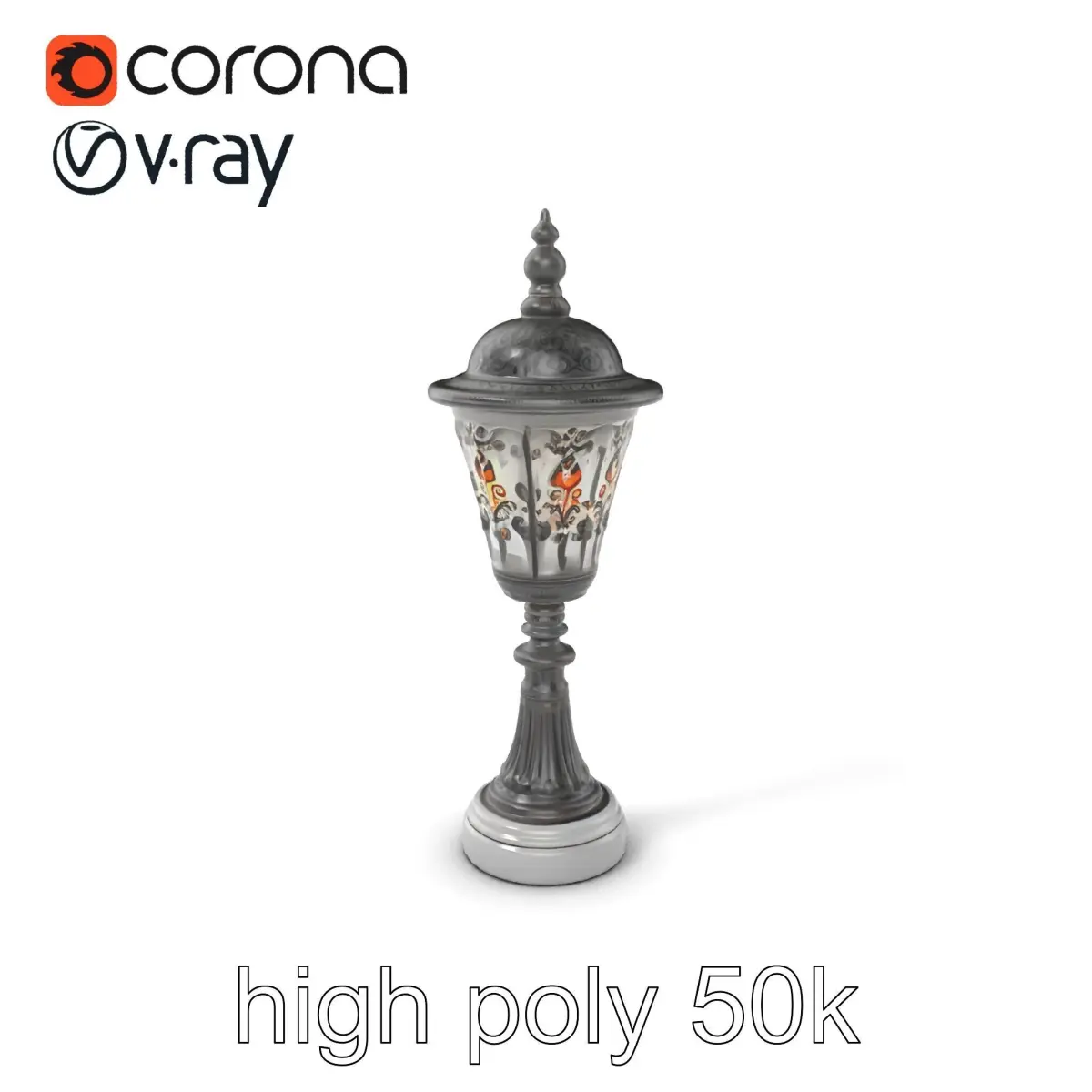 This intricately detailed Victorian lantern post model features a wrought iron design with lace-like patterns and an engraved glass globe. Its stone-like base emulation adds authenticity and charm, making it perfect for architectural visualizations, historical reenactments, fantasy scenes, or as a unique prop in any period setting.