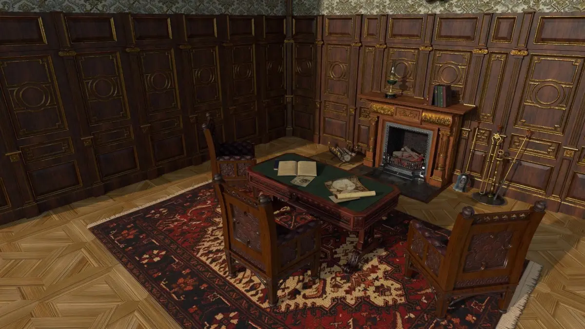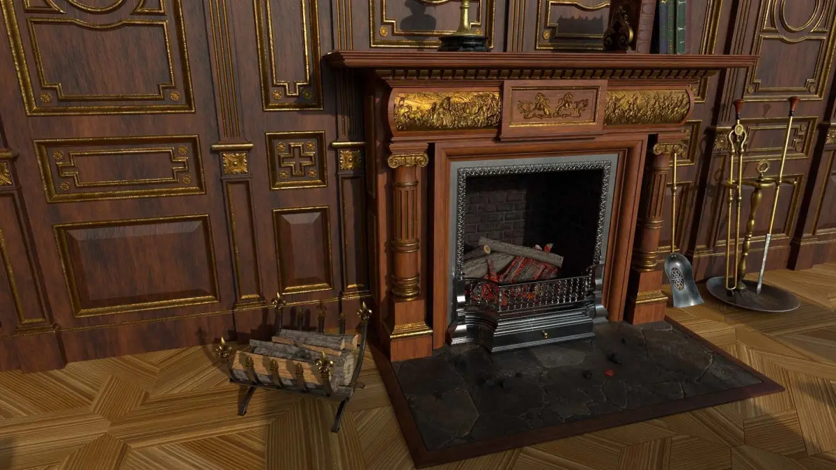 The scene of the Gothic Victorian living room with fireplace set includes fireplace tools, wood storage with wood, burning wood, small gothic table, an upholstered armchair, an oil lamp, an old map, mirror, painting, two different pages, carpet, a bookend and wall panels and a seamless textures of wallpapper and wooden floor and ceiling. Models also have LODs and custom coliders for easy use as game props. Unreal engine 4 project is also included.