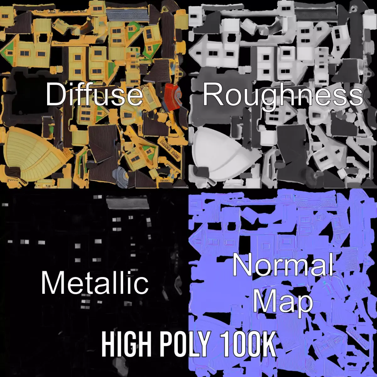 The model's textures are PBR, Diffuse, NormalMap, and reflection/roughness/metallic, which are suitable for any modern rendering engine. All models are accurately unwrapped and have no overlapping UV.