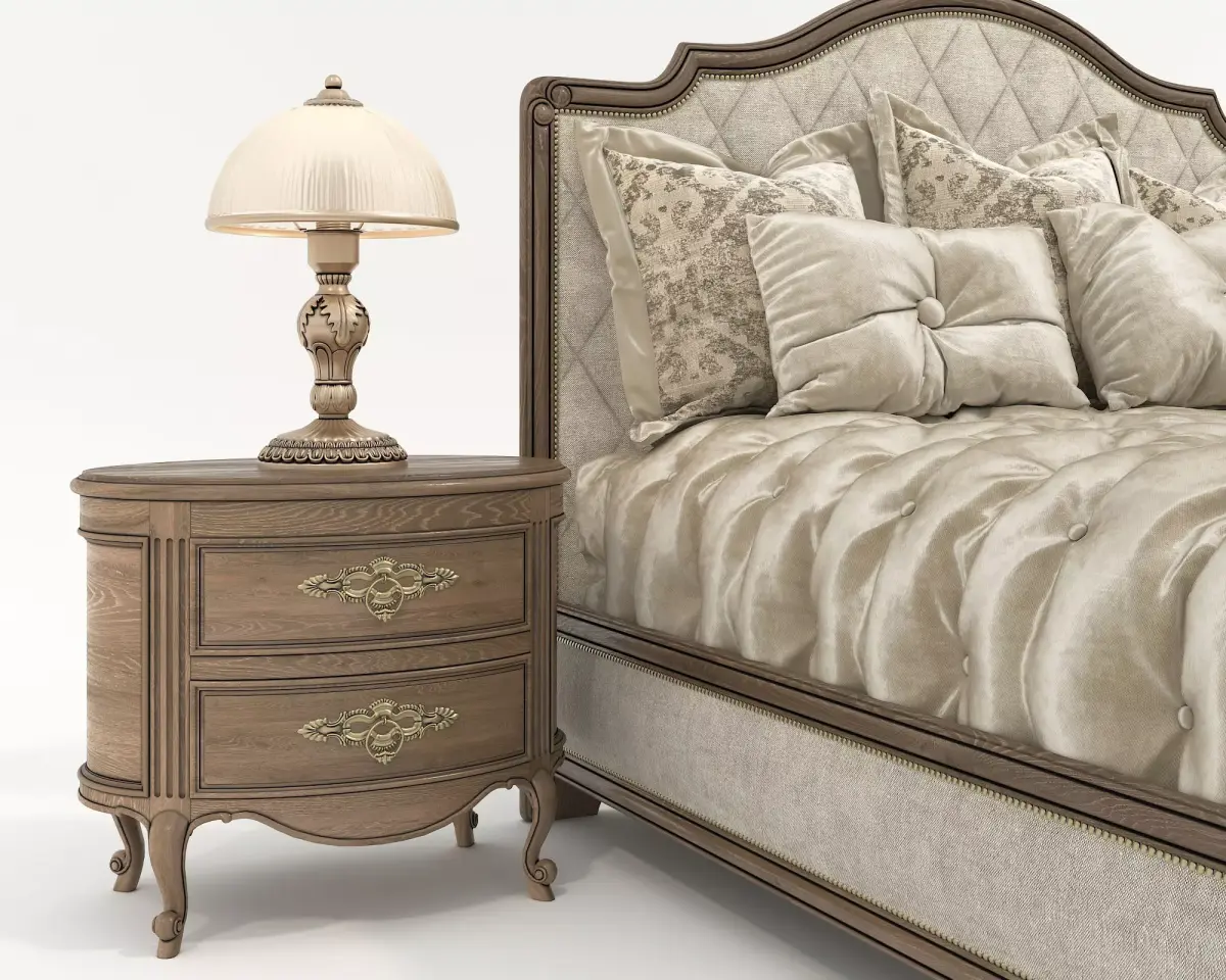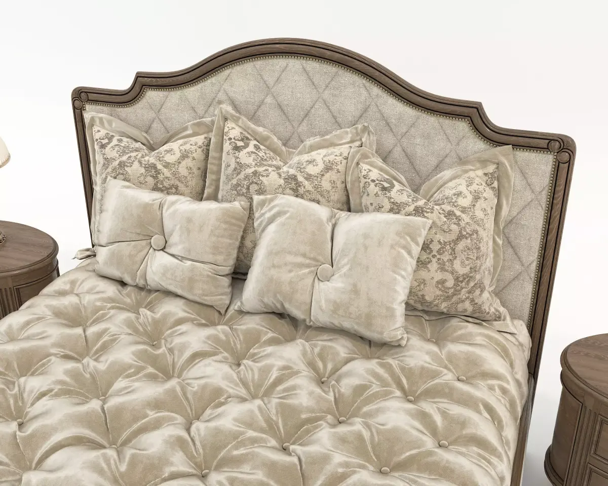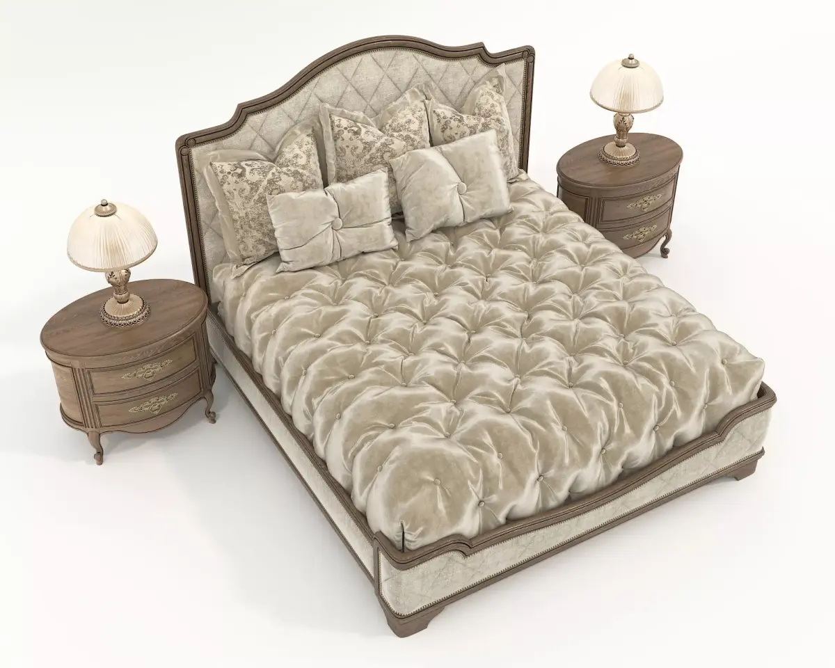 Product DescriptionA highly detailed, professional 3D model of a luxury neoclassical bed set, perfect for high-end interior visualizations. This set includes a master bed with a tufted headboard, premium silk/velvet bedding, two matching wooden nightstands, and classic table lamps.