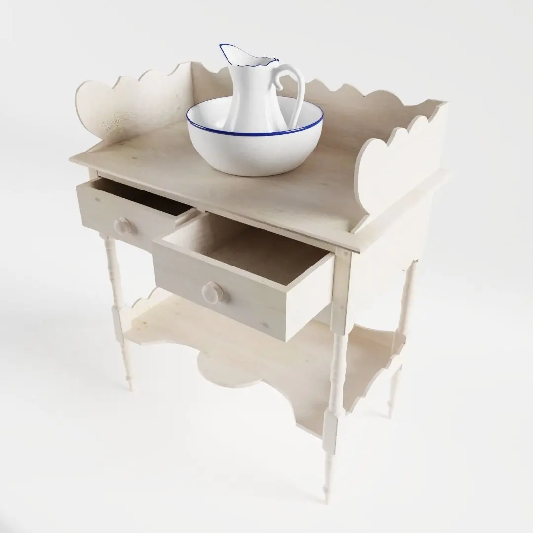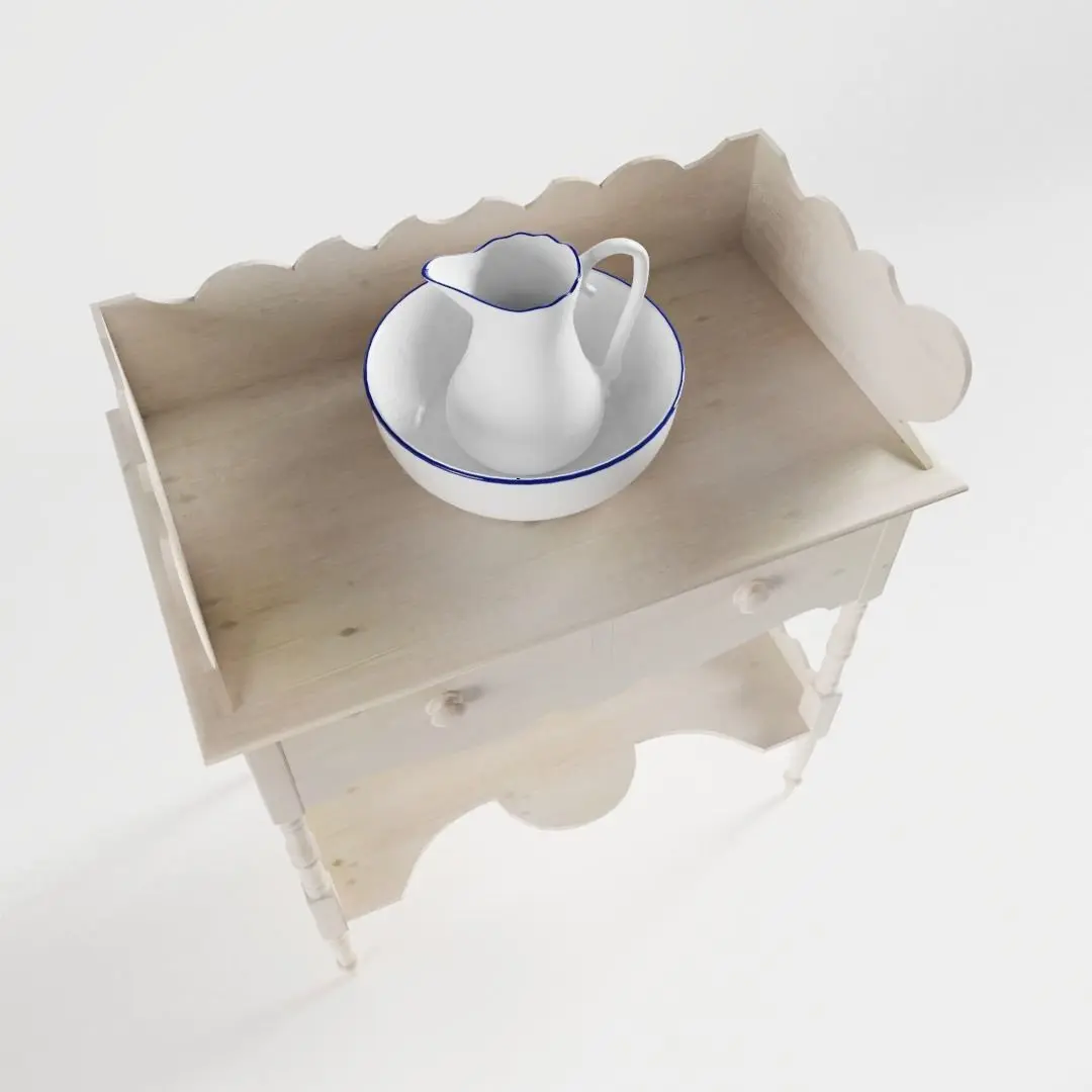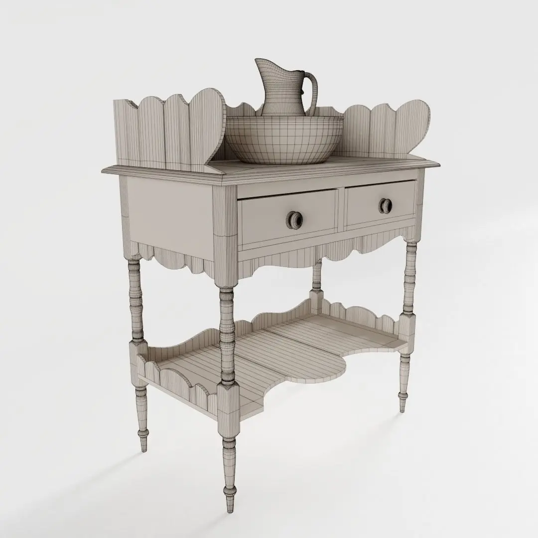 The model has real world scale and the wash stand measures approximately 94 cm in height, 46 cm in depth and 80 cm in length. The stated measurements do not take the dimensions of the jug and the bowl in account.