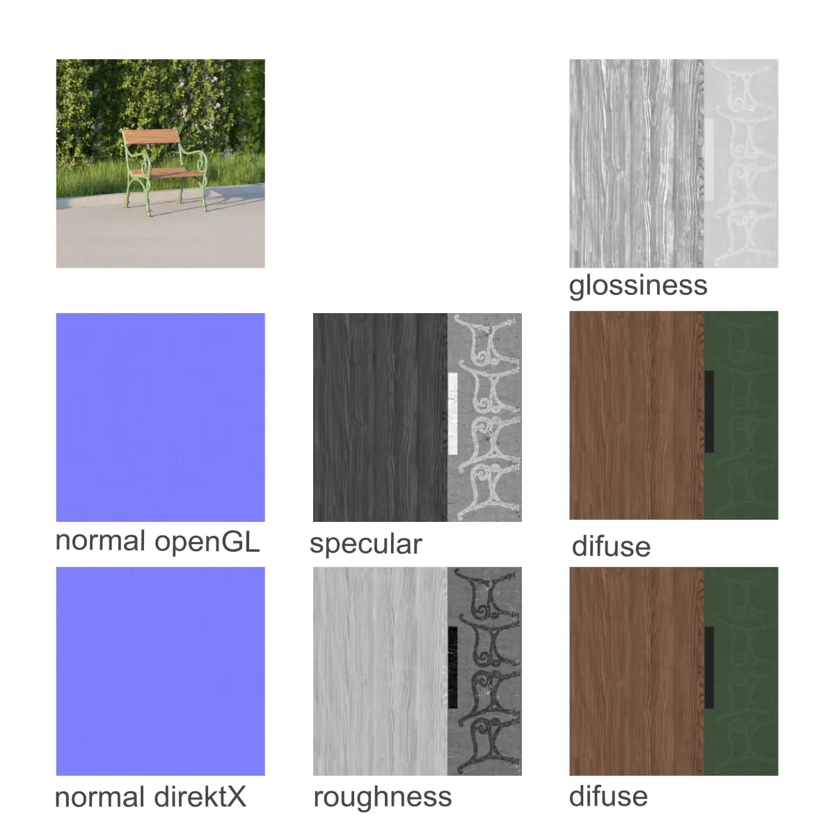 You get PBR flattened textures for VRay Standard Material (VRayMtl), PBR flattend textures for metalness workflow as you can see in the preview images and PBR flattened textures for gltf files (no preview)