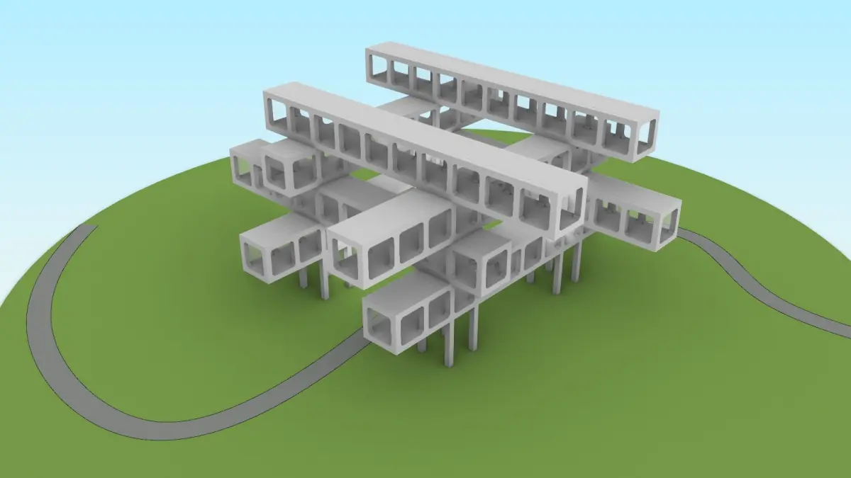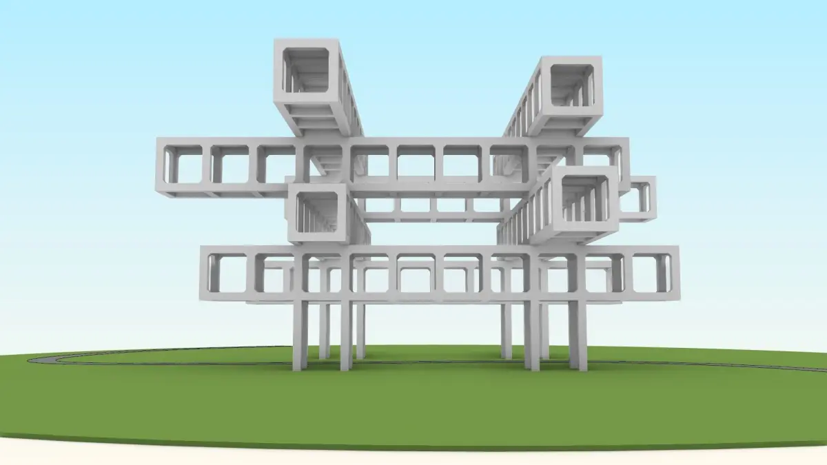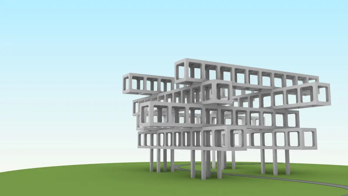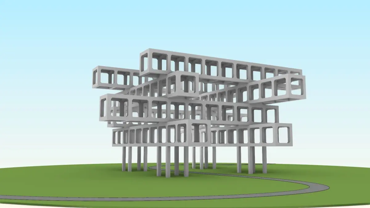 This building is of reinforced concrete (RC) construction. It has four floors, each with a height of 3.0 meters. The building spans 30 meters in both the long and short directions, with column spacing of 500 millimeters. The distinctive features include the use of Vierendeel truss and the ability to achieve long spans.This 3D model is an original creation of mine based on my own knowledge and research.