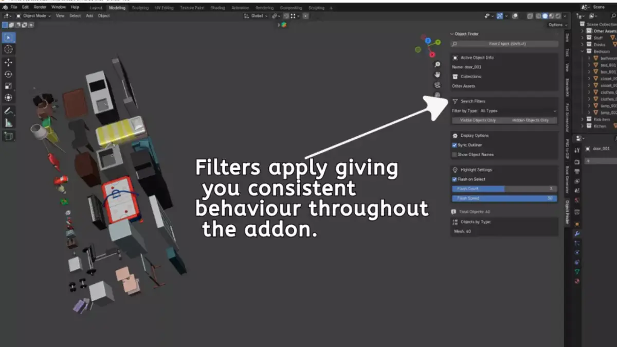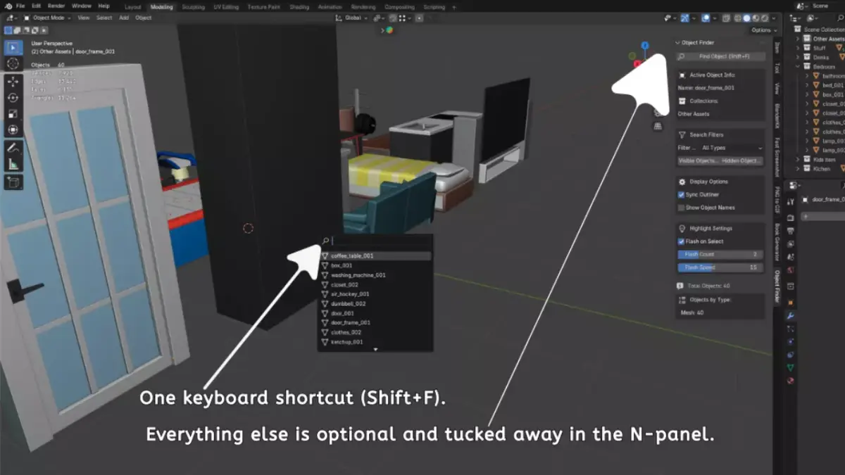 The Viewport Object Finder is the essential productivity addon for every Blender artist. If your scene has 10 objects or 10,000, finding the right one should take seconds, not minutes. This addon makes that possible.