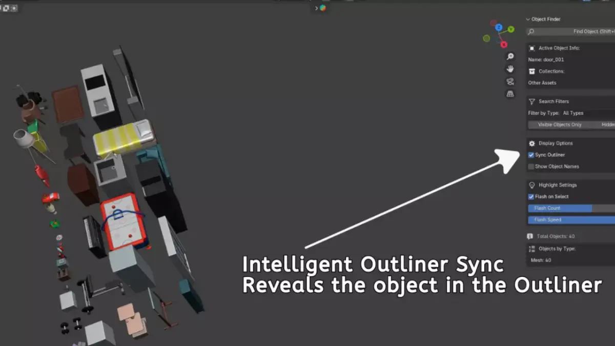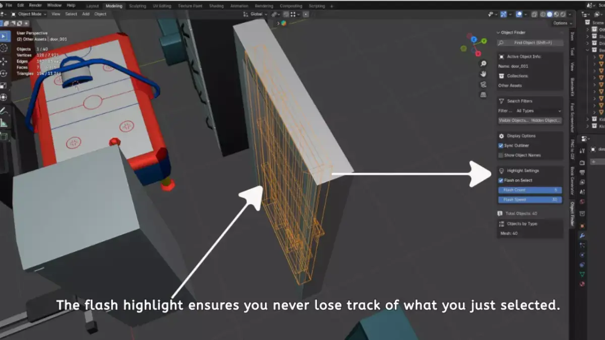 Visual Flash HighlightWhen you select an object, it flashes with a customizable wireframe effect.Never lose track again — even in dense scenes. Adjust flash count (1-5) and speed to fit your workflow.