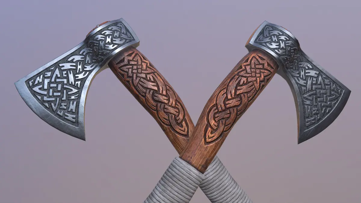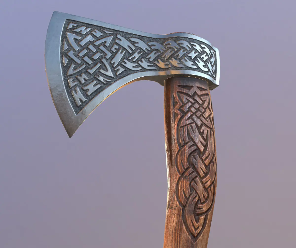 This viking axe is engraved with viking symbols.