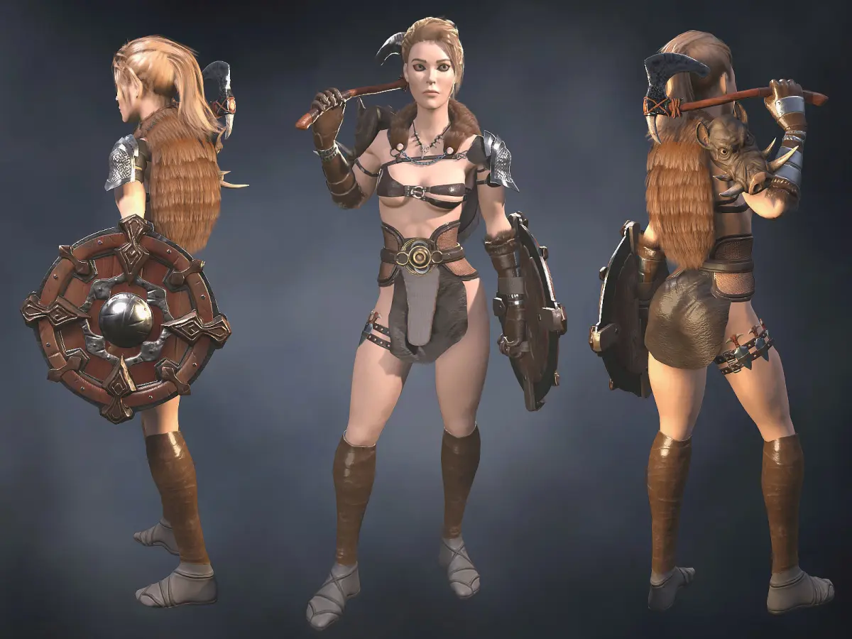 Introducing a stunning game model of a Viking girl that embodies strength, confidence, and bravery. She presents herself in an exotic attire, blending armor with a revealing outfit. The unparalleled style of the model captivates the gaze, featuring a leather bra, a leather skirt, a cloak, and a shoulder pad in the shape of a boar's head. The model is adorned with a metallic shoulder pad, adding an extra element of protection. Leather boots and gloves complete the look, showcasing her assurance and stellar craftsmanship.