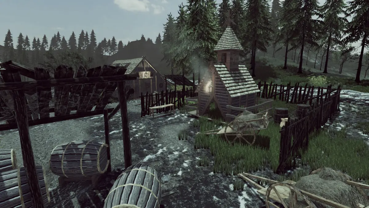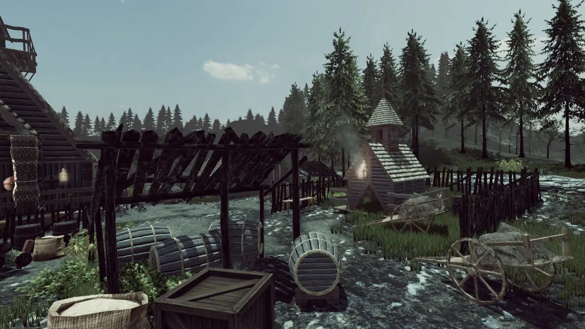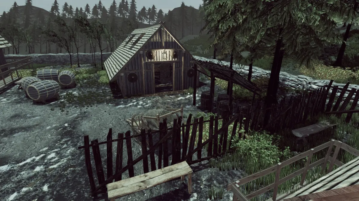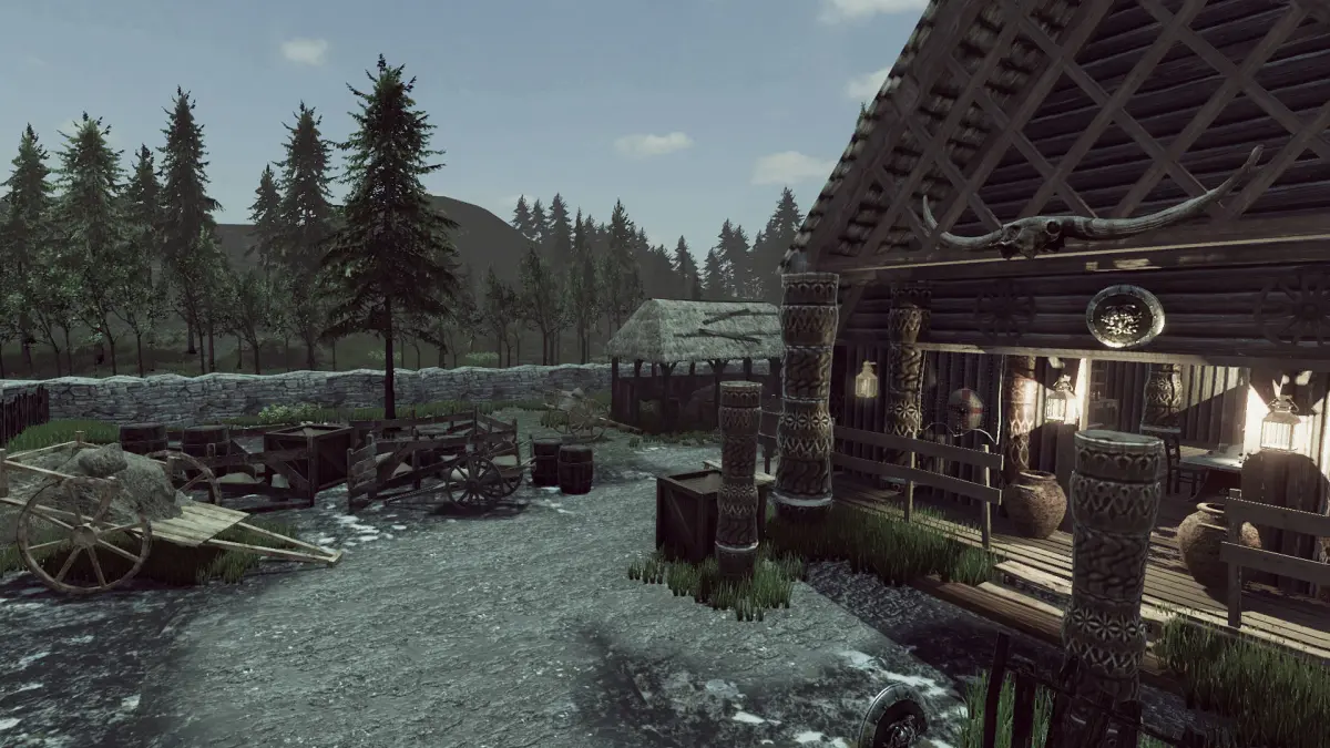 Viking House 3D model with over 70 additional props like tools, barrels, barns, stables, boxes, hay wagons and others.
