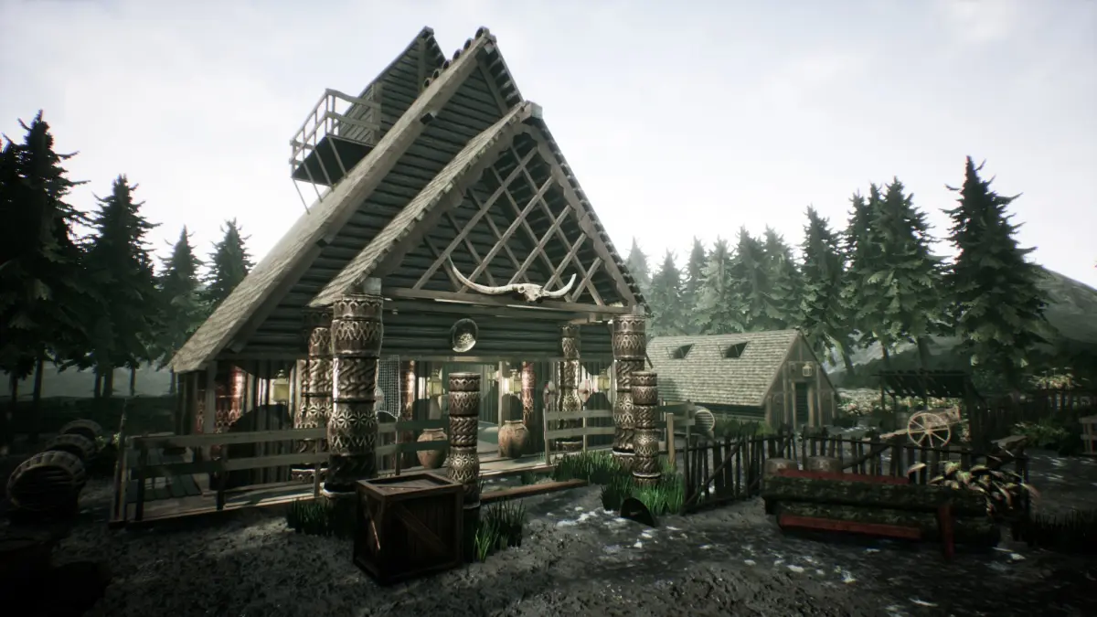 Viking House 3D model with over 60 additional props such as household tools, furniture, barrels, barns, stables, boxes, hay wagons and others. Including additional 5 wooden houses with interiors and decorative elements. All are presented in the images and presentational video.