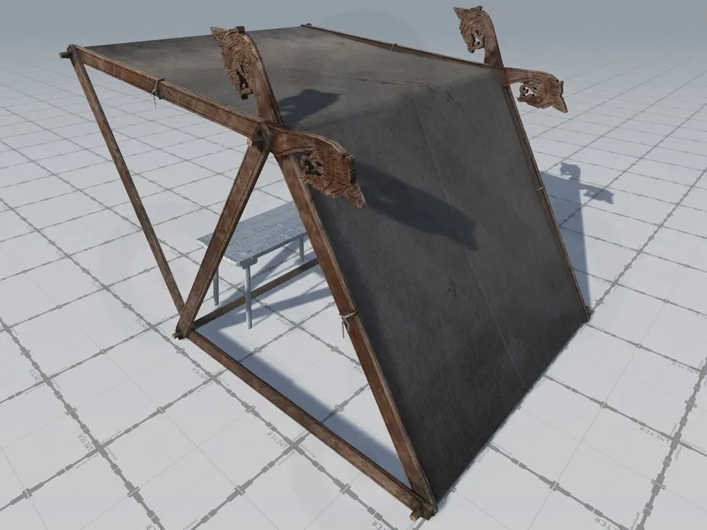 This is a early medieval / viking market tent / market stall. It is a possible interpretation from the remains of the Gokstad ship burial. The tent is made from heavy linen and carved wooden boards. It needs the cull mode to draw the back faces, the tent fabric is only a one sided plane. In Unity you may use a double sided shader (https://assetstore.unity.com/packages/vfx/shaders/double-sided-shaders-23087). Use it for example to build your viking trading post, or a medieval market place, or maybe a camp for your adventurers?