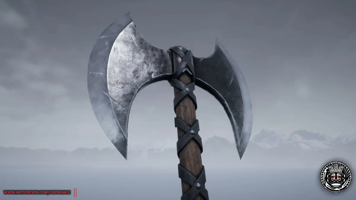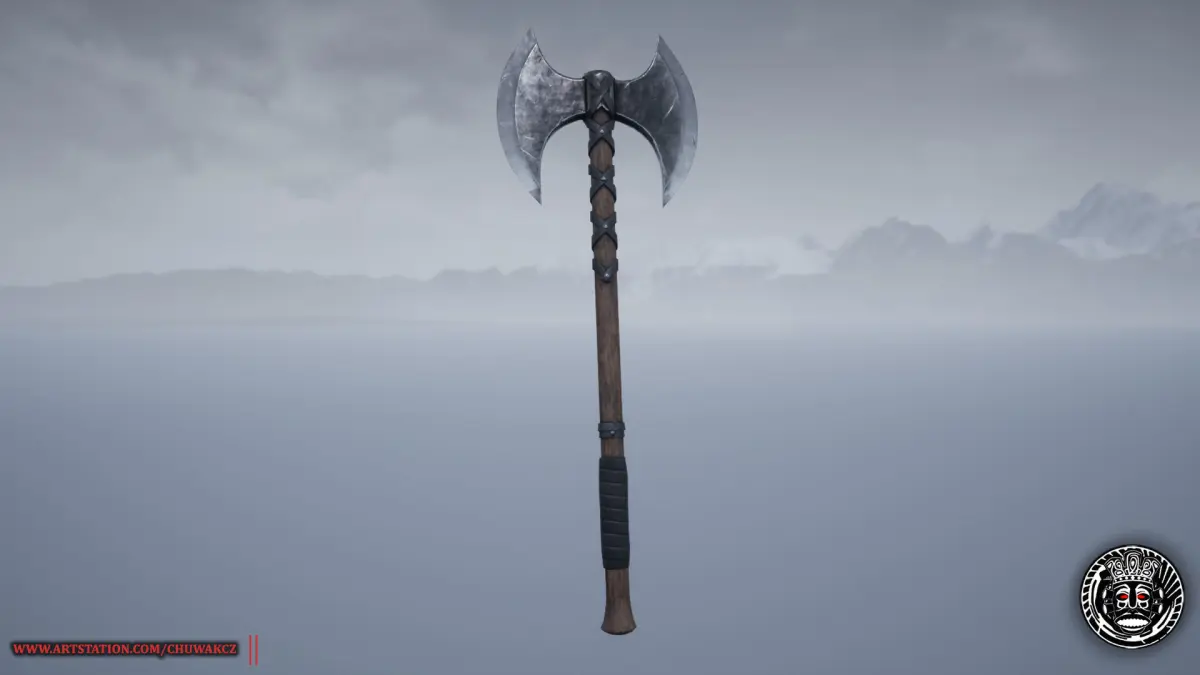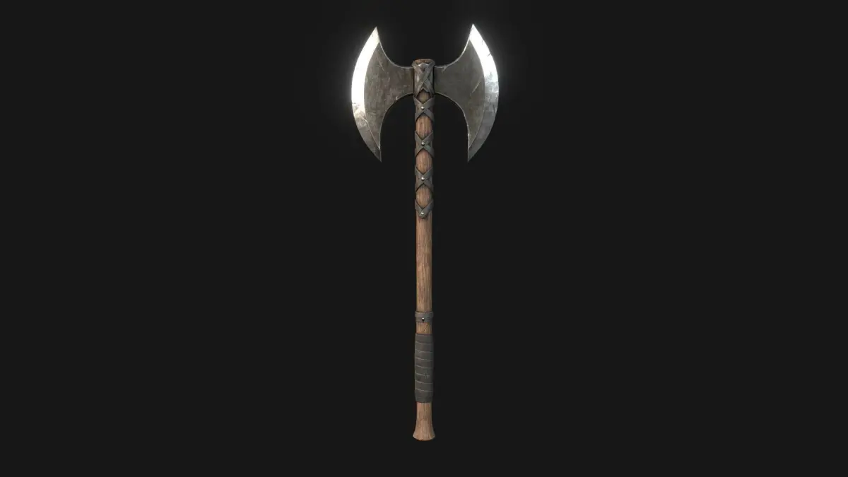The build of the weapon is thick and straight with a massive double bladed head on top. The double bladed head of the axe is made from hardened steel and the handle is wooden with realistic texture and wood rings wrapped around with black leather. The overall look of the axe is new with a few scratches and other damage it suffered in battles. Perfect for any medieval viking character or environment.