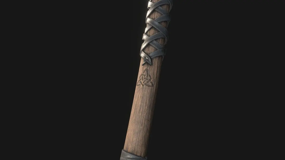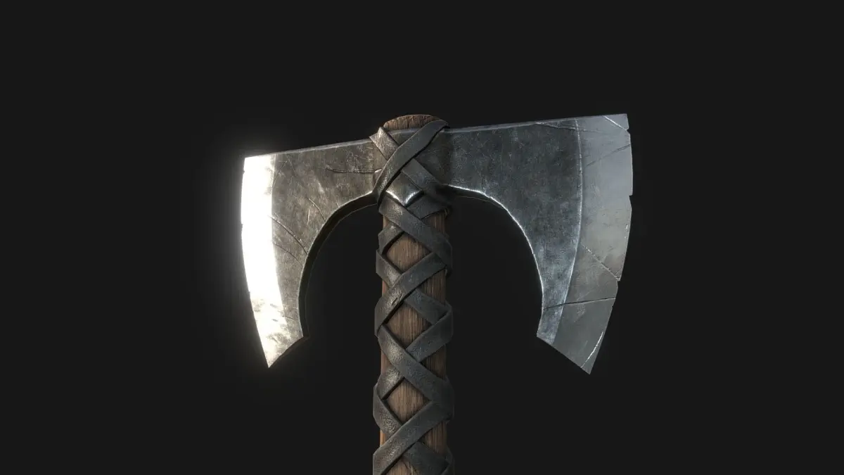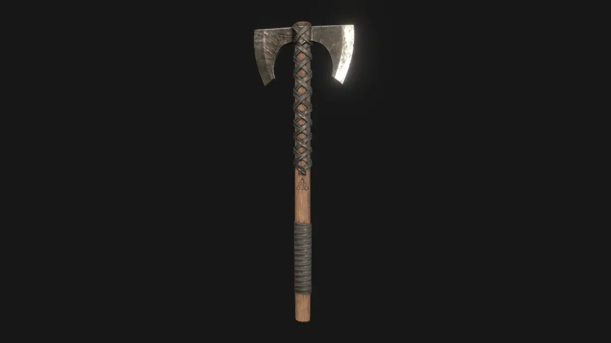 The double bladed head of the axe is made from hardened steel and the handle is wooden with realistic texture and wood rings wrapped around with black leather. The overall look of the axe is new with a few scratches and other damage it suffered in battles. Perfect for any medieval viking character or environment.