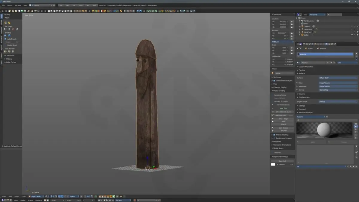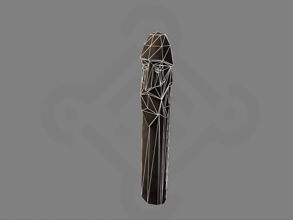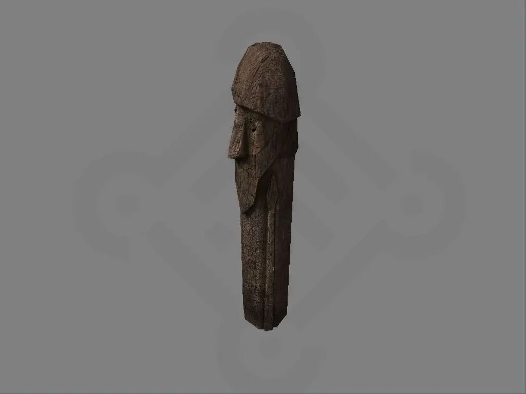 This model shows a so called norse pole god. It is carved from a log and put in a sacred area where people can bring sacrifices and worship the depicted deity, in this case the Allfather Odin, the one-eyed god with his spear Gungnir.