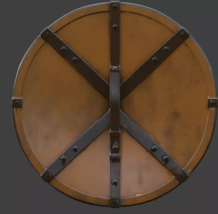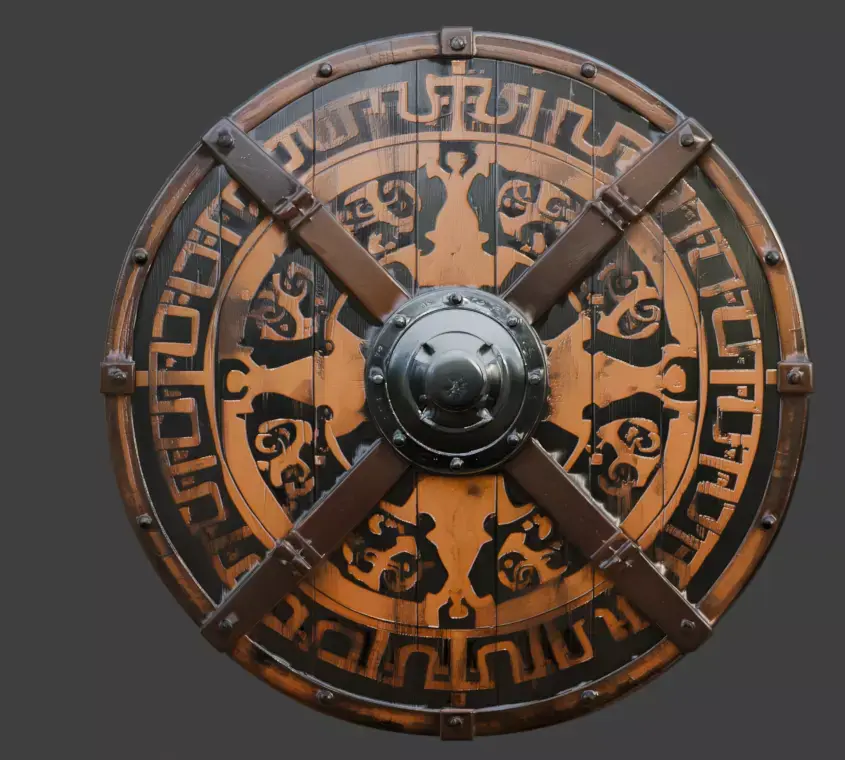 Tags3d model viking shield round shield nordic weapon game ready asset battle worn wooden shield iron boss viking equipment nordic patterns realistic texture historical armament warrior gear chipped paint medieval prop fantasy weapon pbr materials digital sculpture combat gear shield prop