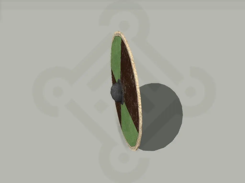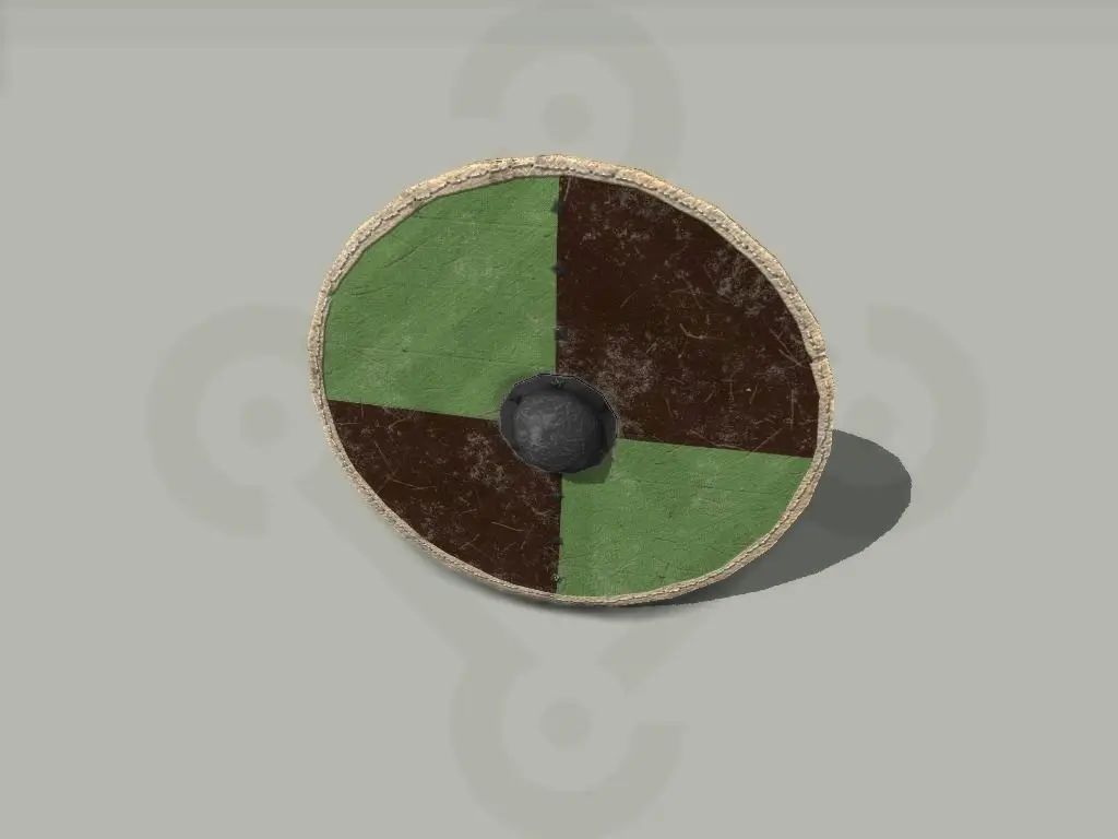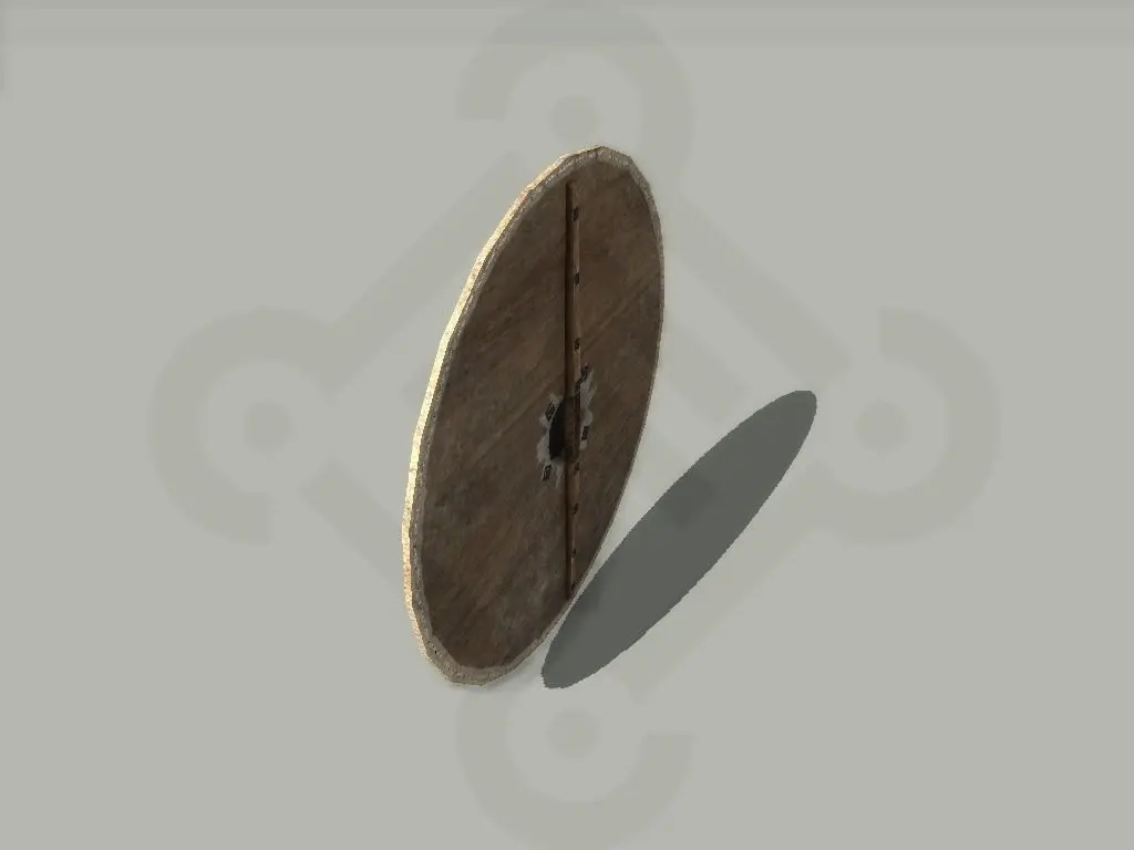 This is a typical viking round shield. It is built from wooden planks, has a round, hollow boss made from steel, a rim made out of raw hide, which is sewn through the planks to reinforce the shield. glued to the front side is a layer of linen cloth, which also reinforces the shield and prevents the planks from splintering.The boss and the wooden handle are held in place by iron rivets, the handle is wrapet by leather. This sort of shield is not fastened to the lower arm, it is only held by the handle, so it can swing and deflect blows.