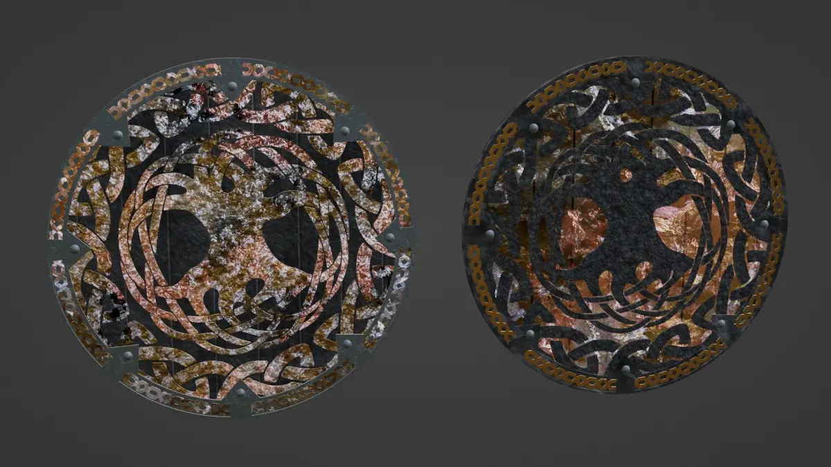 This model was created in a way to make it look like a realistic viking shield. Preview images were rendered with Blender Eevee and Cycles.