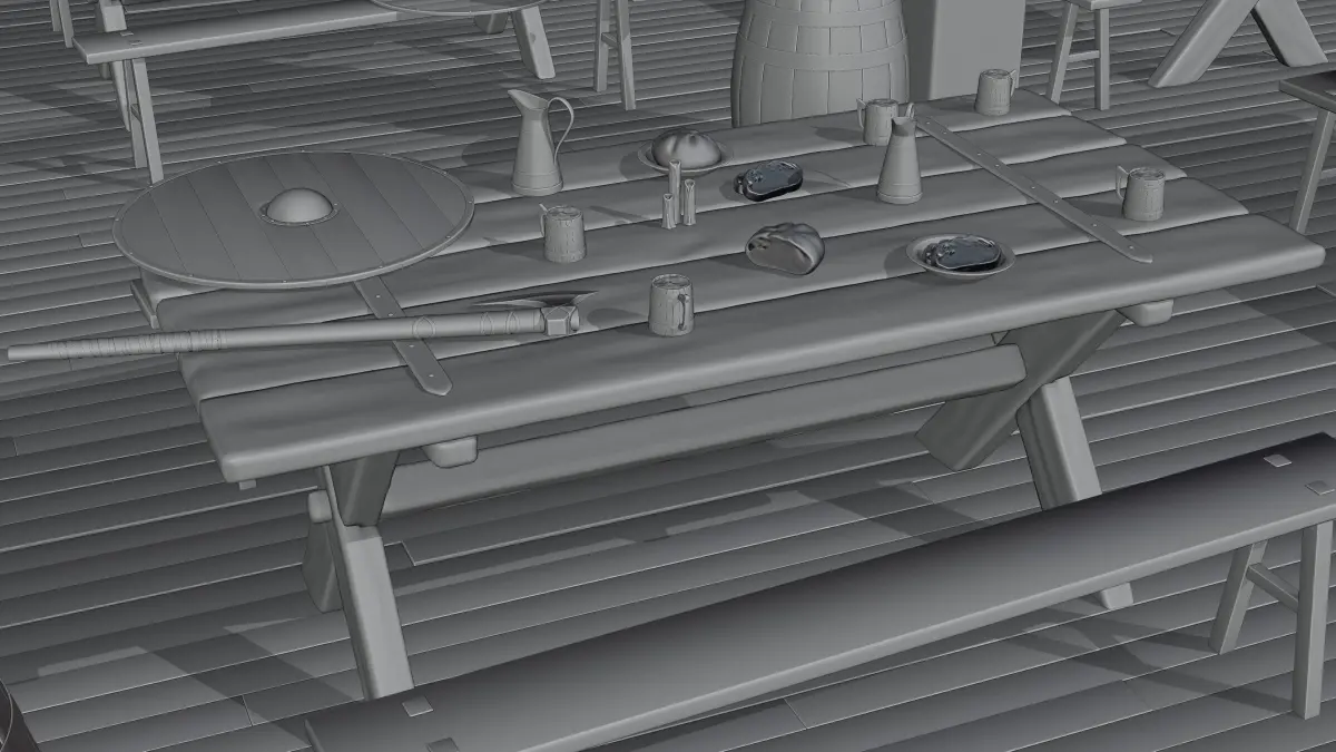 The larger models have 4096x4096 textures for the main table, wooden floor, columns, etc. The scene elements have smaller textures ranging from 2048x2048 to 512x512, depending on the object dimensions.